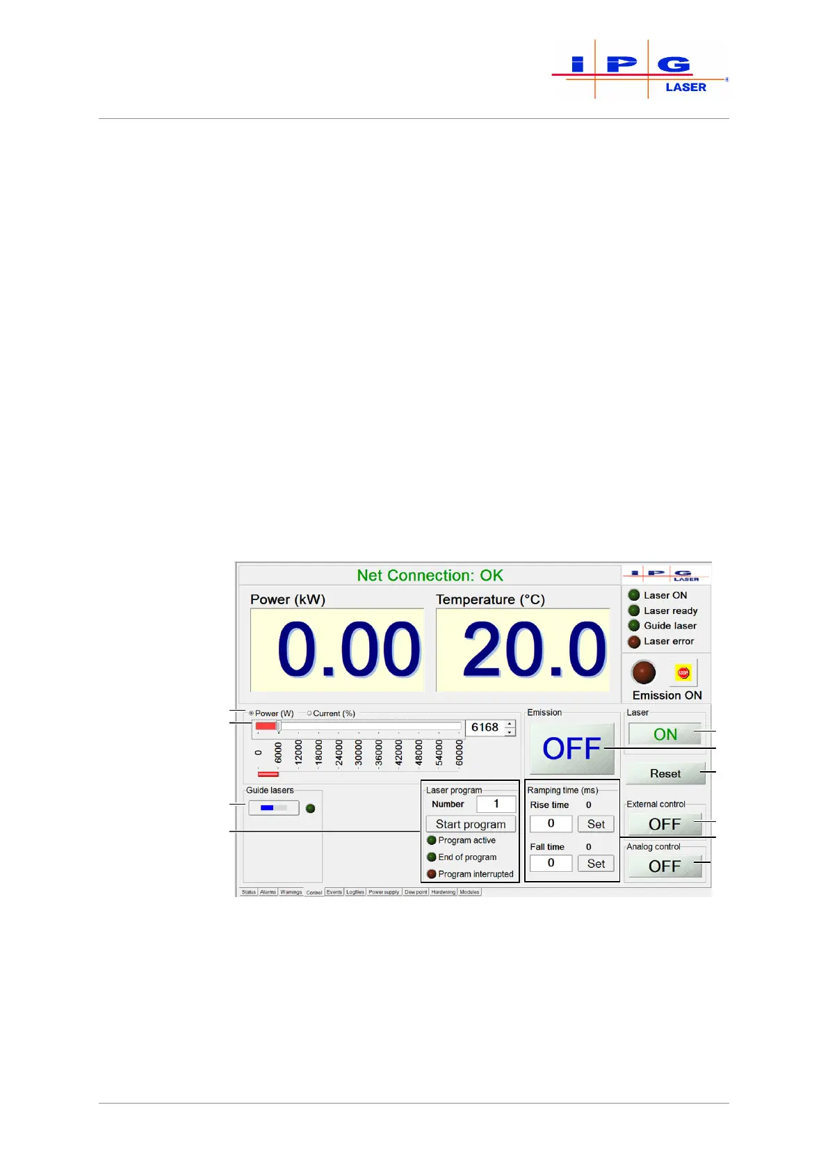 the Status tab, the status LED indicator “Guide laser ON” lights up green.