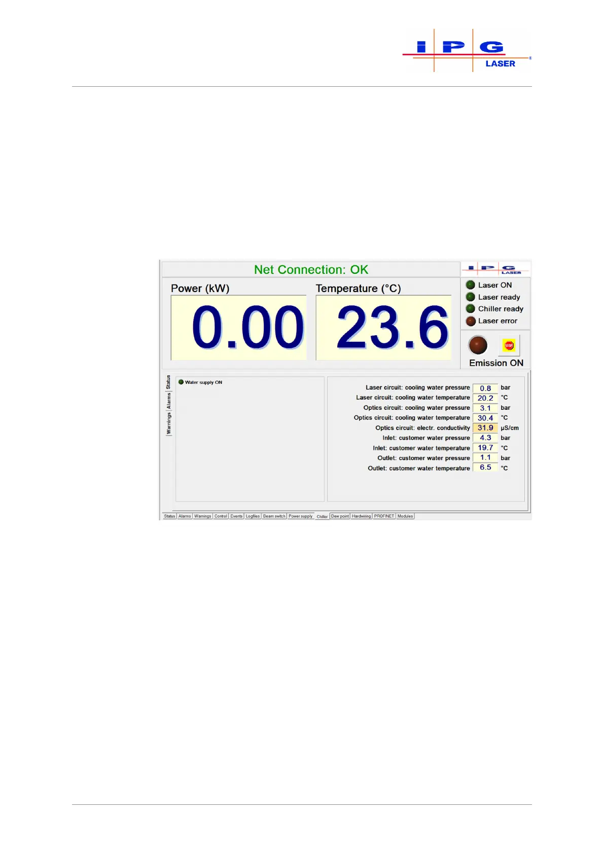 Actual values of the laser chiller are displayed in this tab (see Fig. Chiller