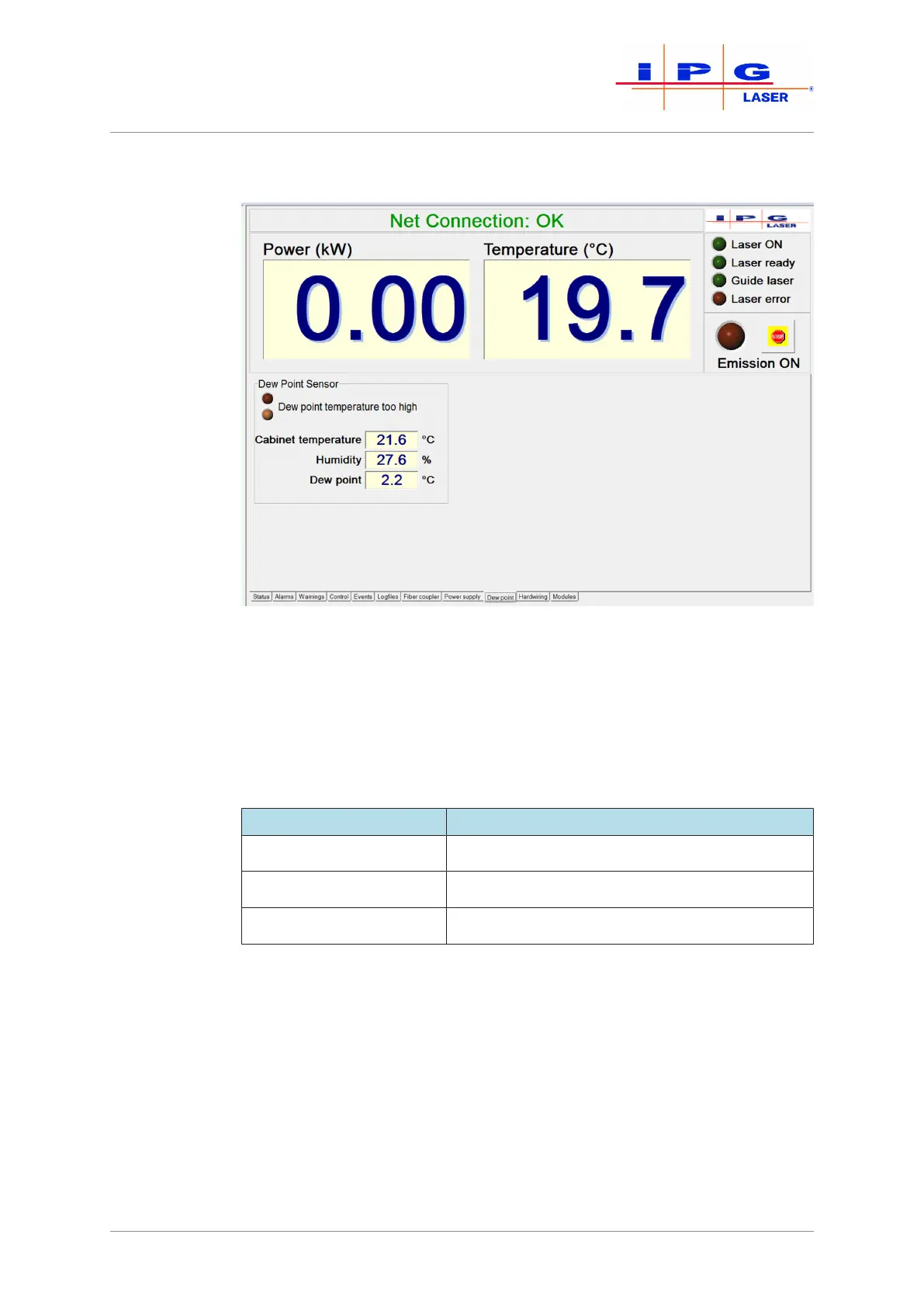 Dew point Calculated dew point in the laser cabinet