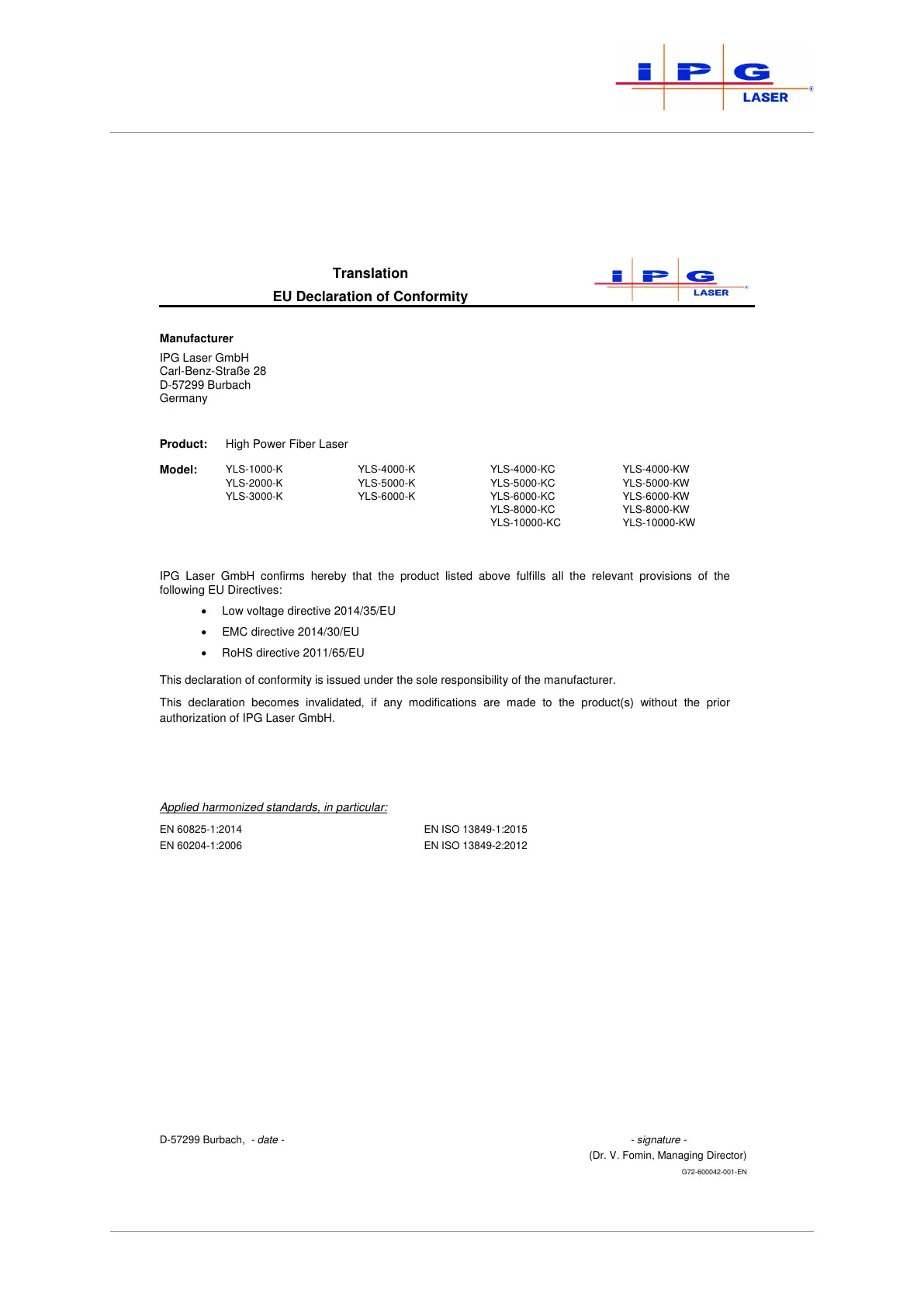 IPG Laser GmbH confirms hereby that the product listed above fulfills all the relevant provisions of the