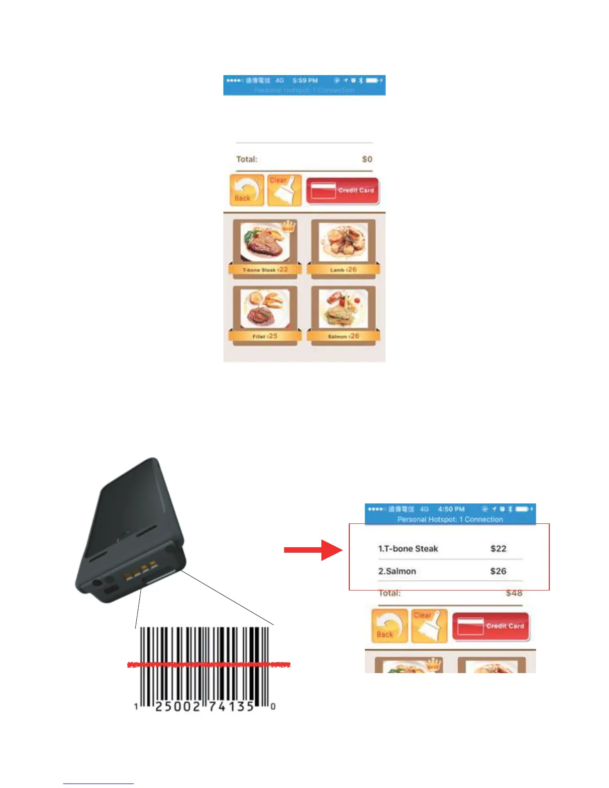 Using the scanner to scan a barcode simulates the input of a menu item and the item will be