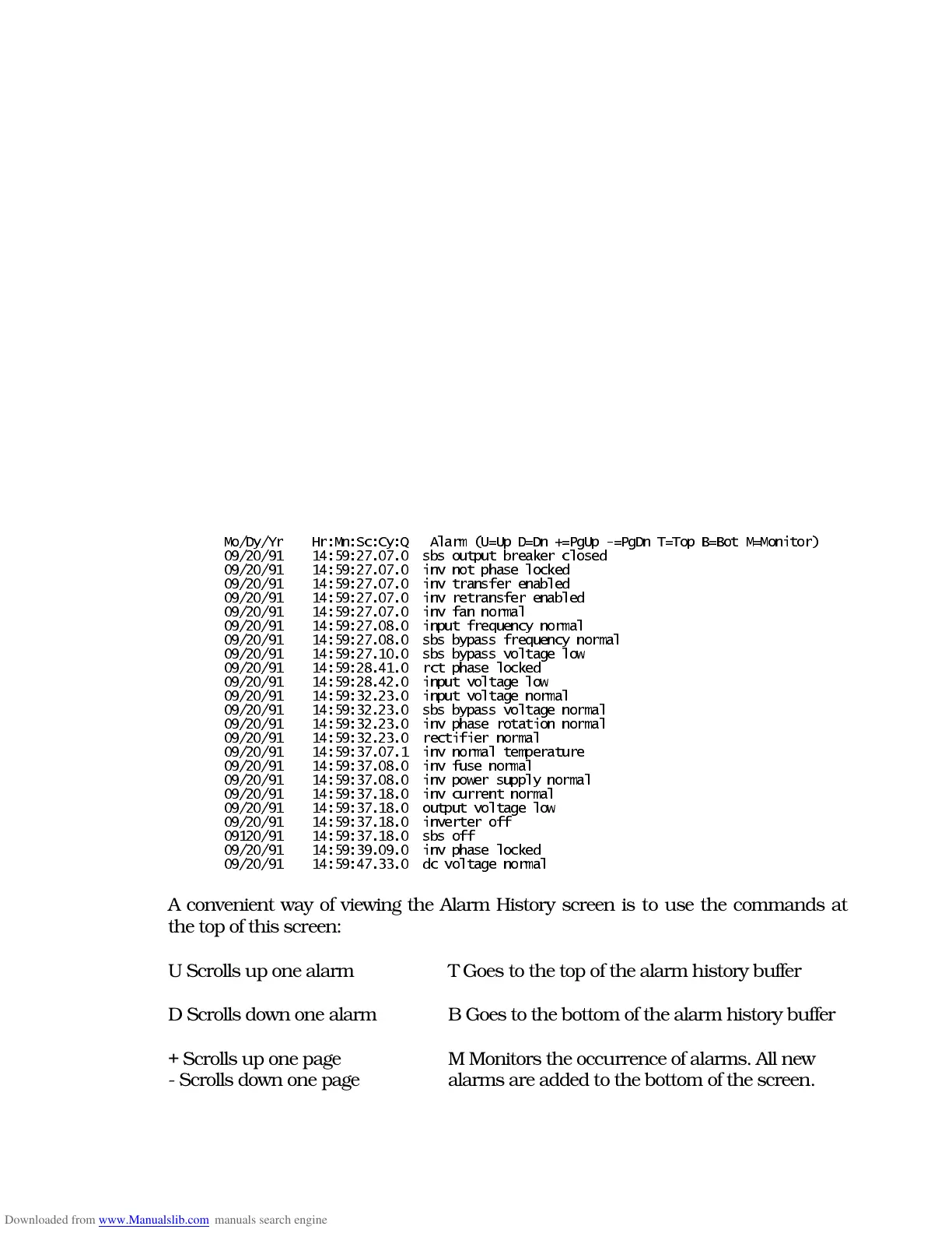 U Scrolls up one alarm T Goes to the top of the alarm history buffer