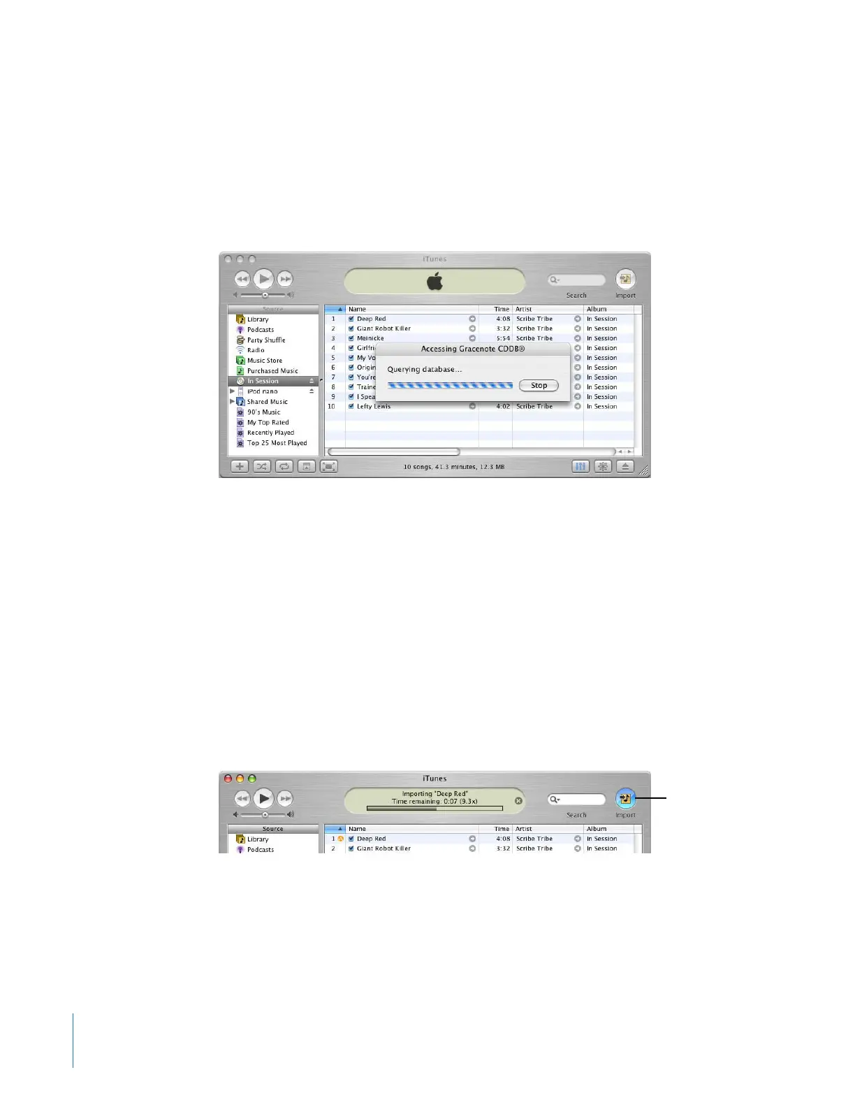 3 Click the Import button. The display area at the top of the iTunes window shows how