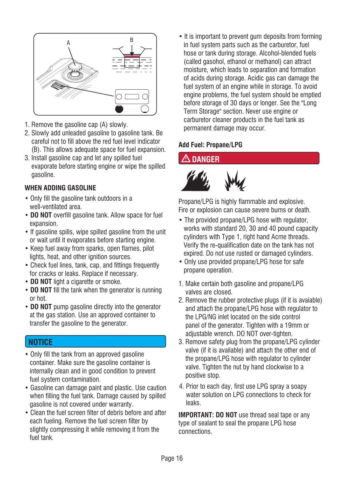 • DO NOT fill the tank when the generator is running