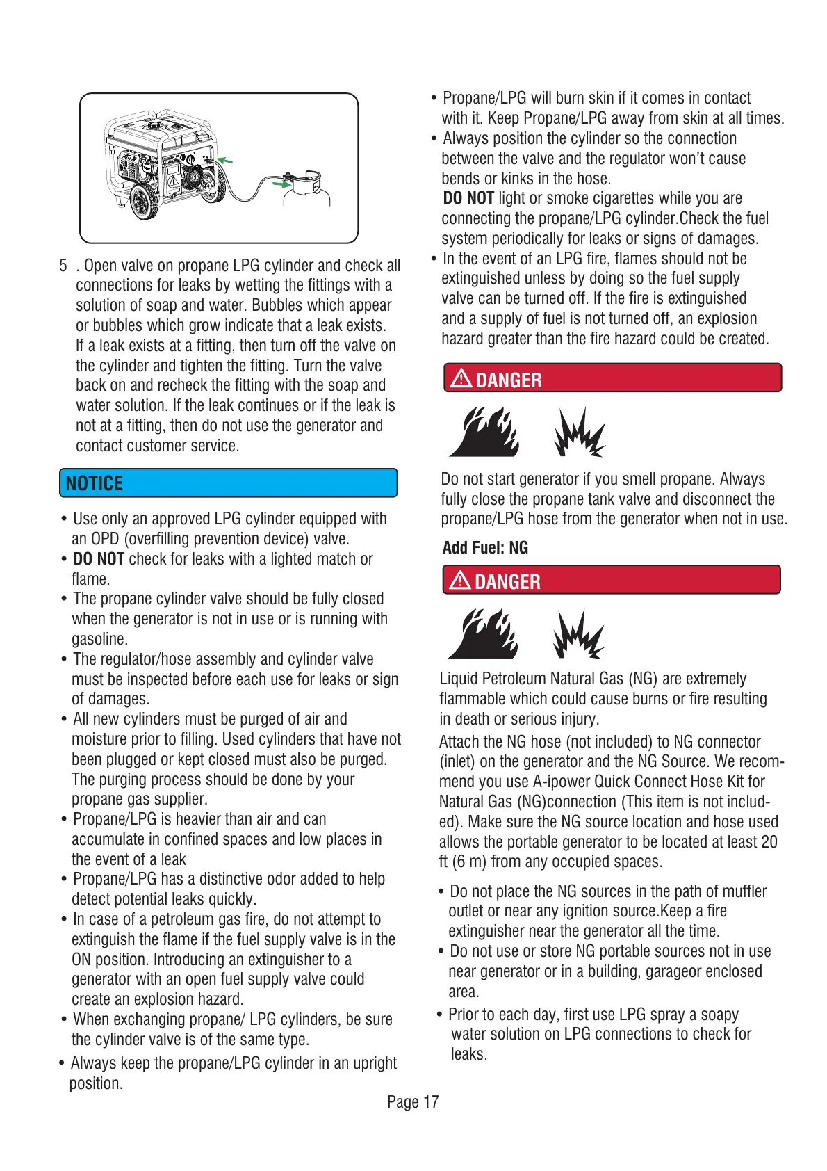 • Propane/LPG will burn skin if it comes in contact
