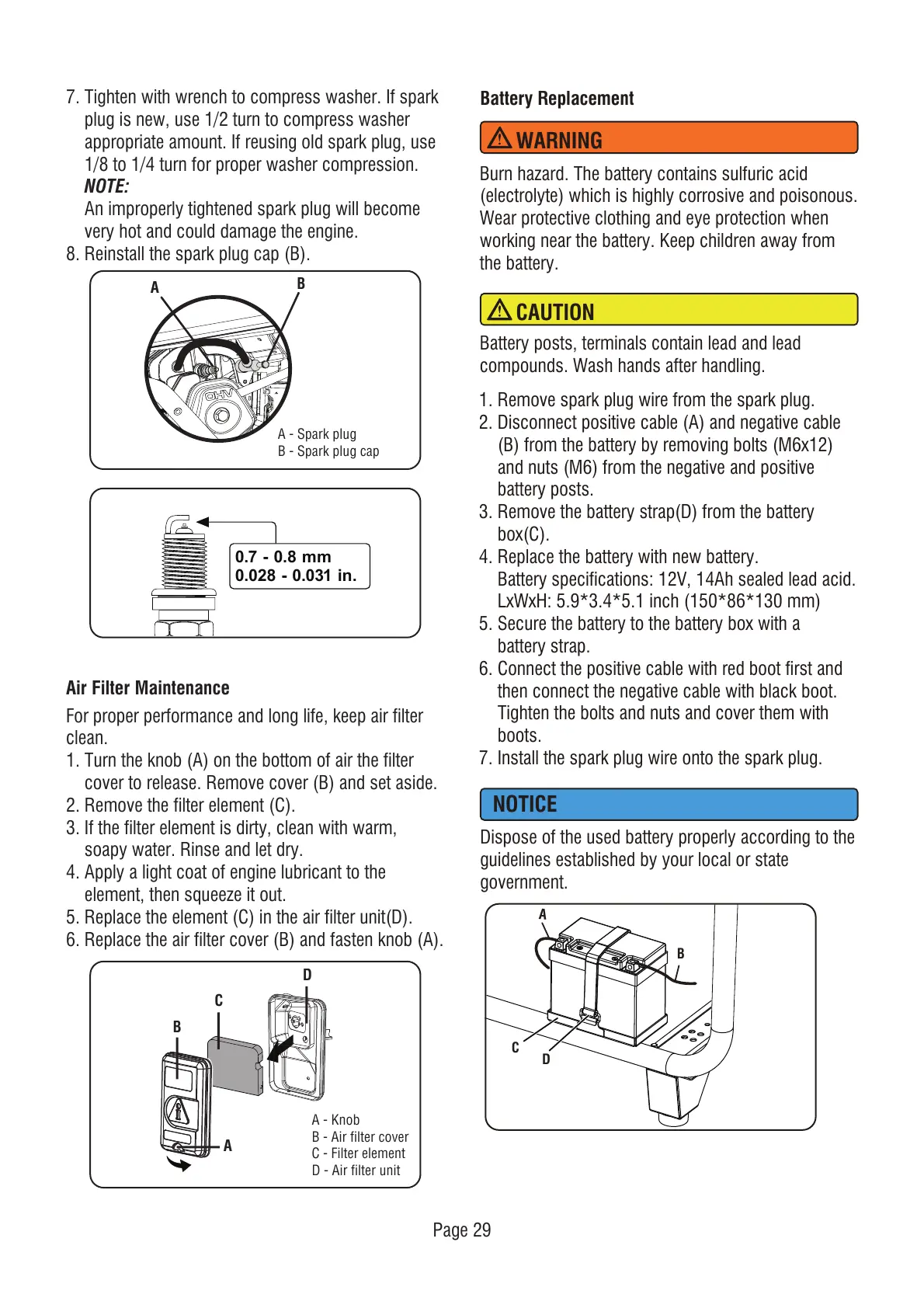 Battery specifications: 12V, 14Ah sealed lead acid.