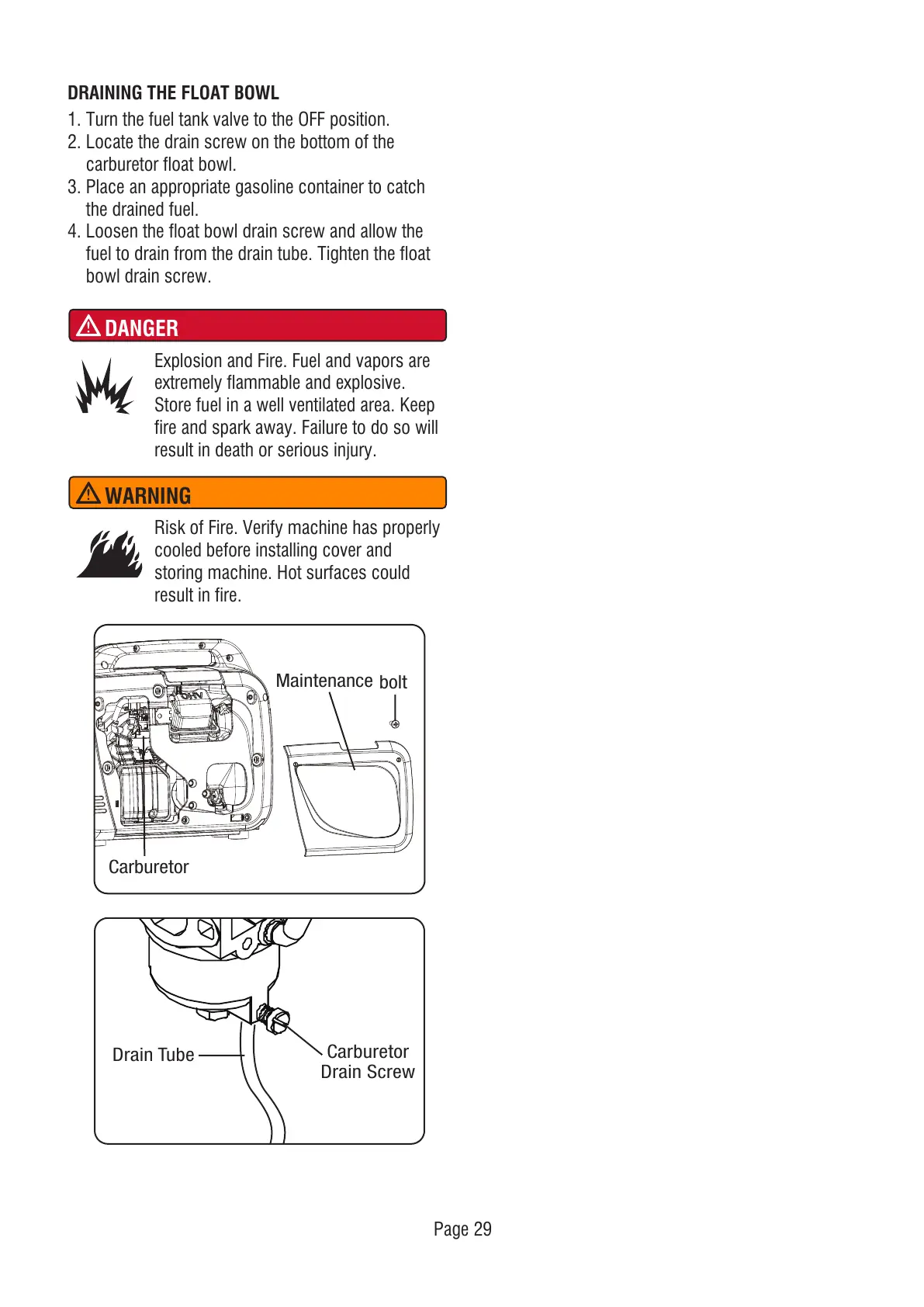 fuel to drain from the drain tube. Tighten the float