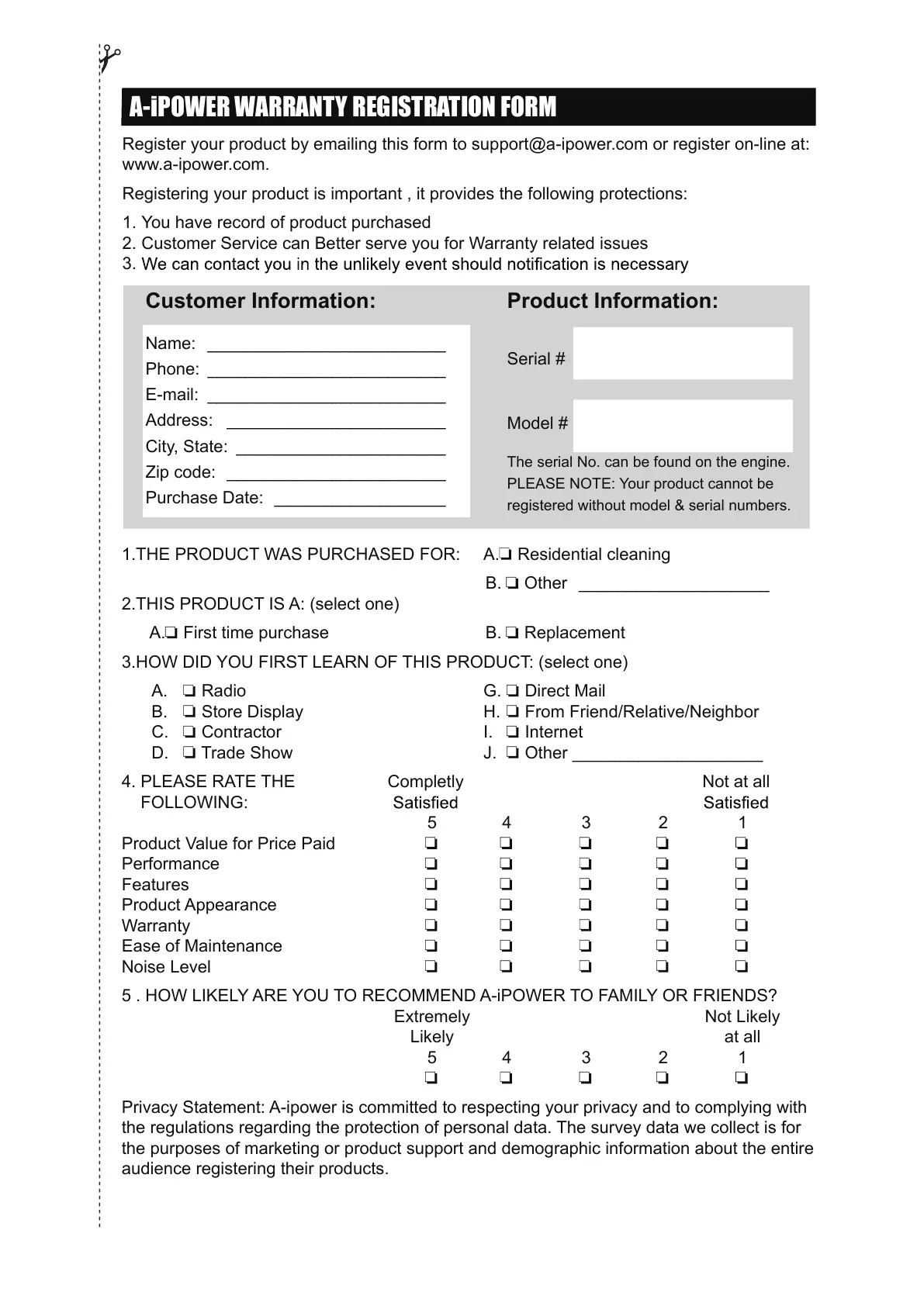 Register your product by emailing this form to support@a-ipower.com or register on-line at: