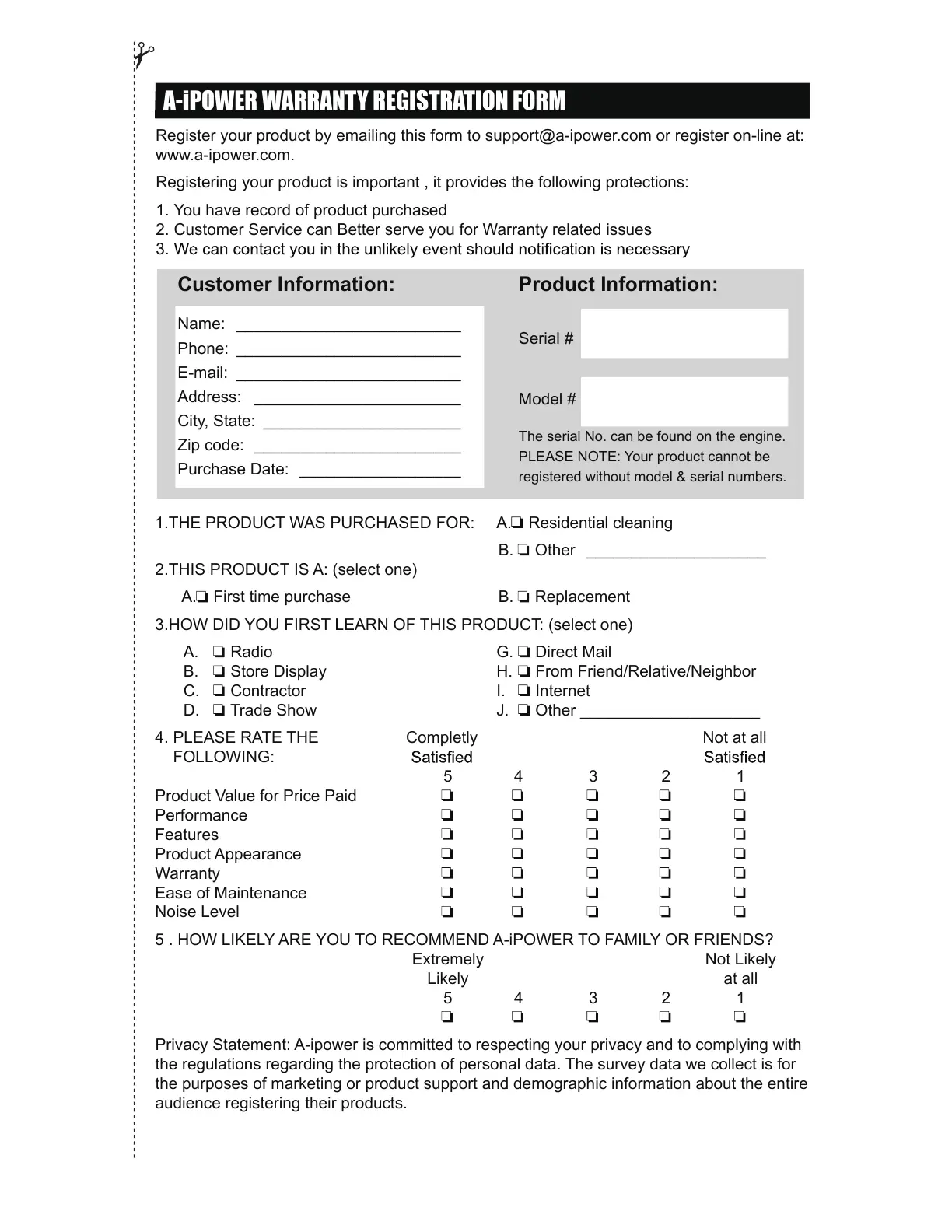 Register your product by emailing this form to support@a-ipower.com or register on-line at: