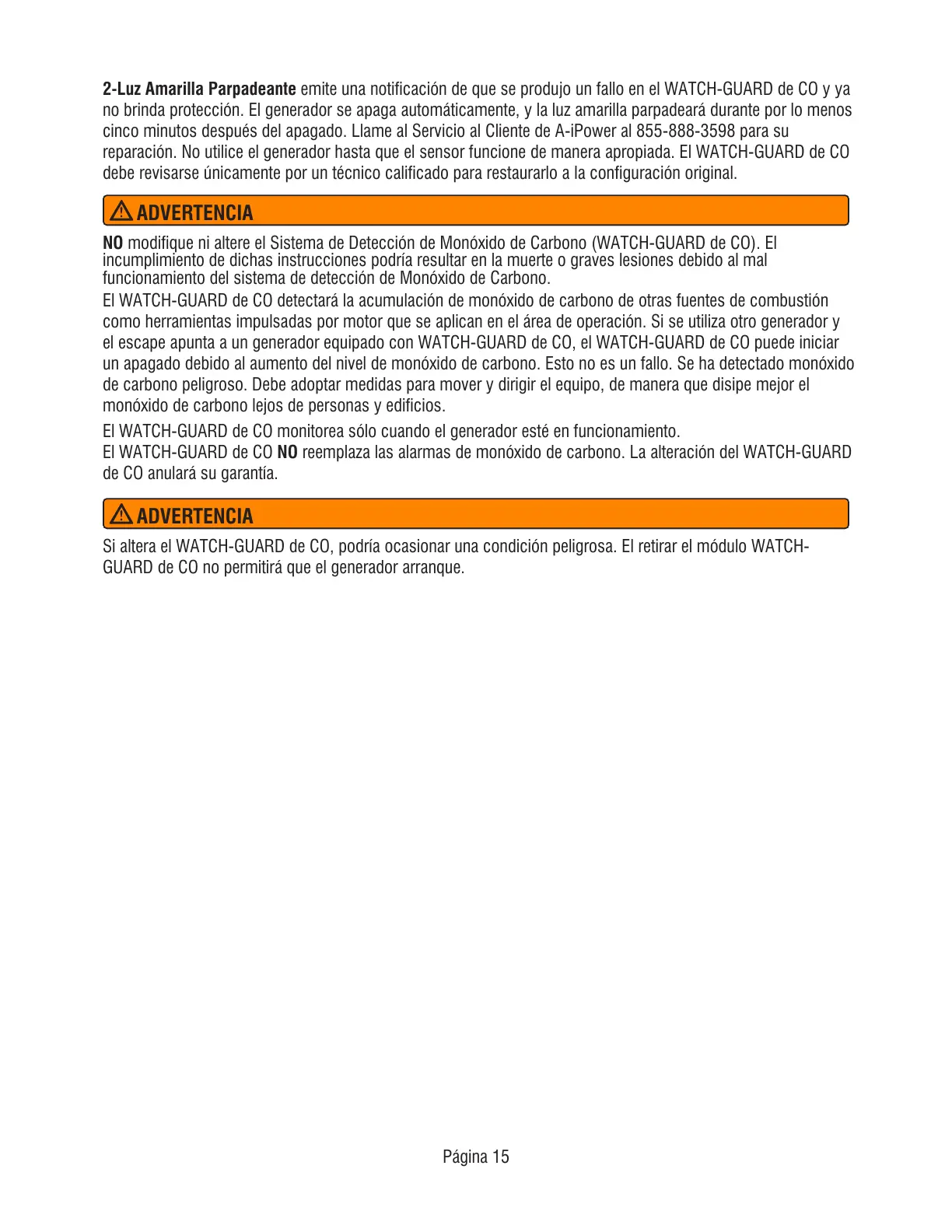 NO modifique ni altere el Sistema de Detección de Monóxido de Carbono (WATCH-GUARD de CO). El
