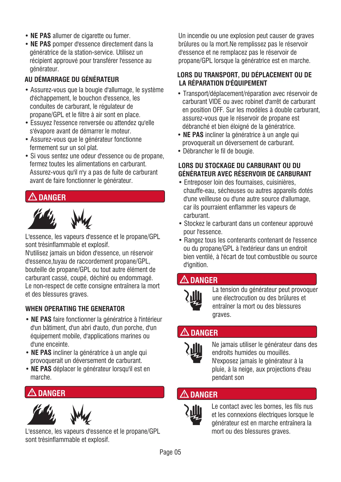 • NE PAS faire fonctionner la génératrice à l'intérieur