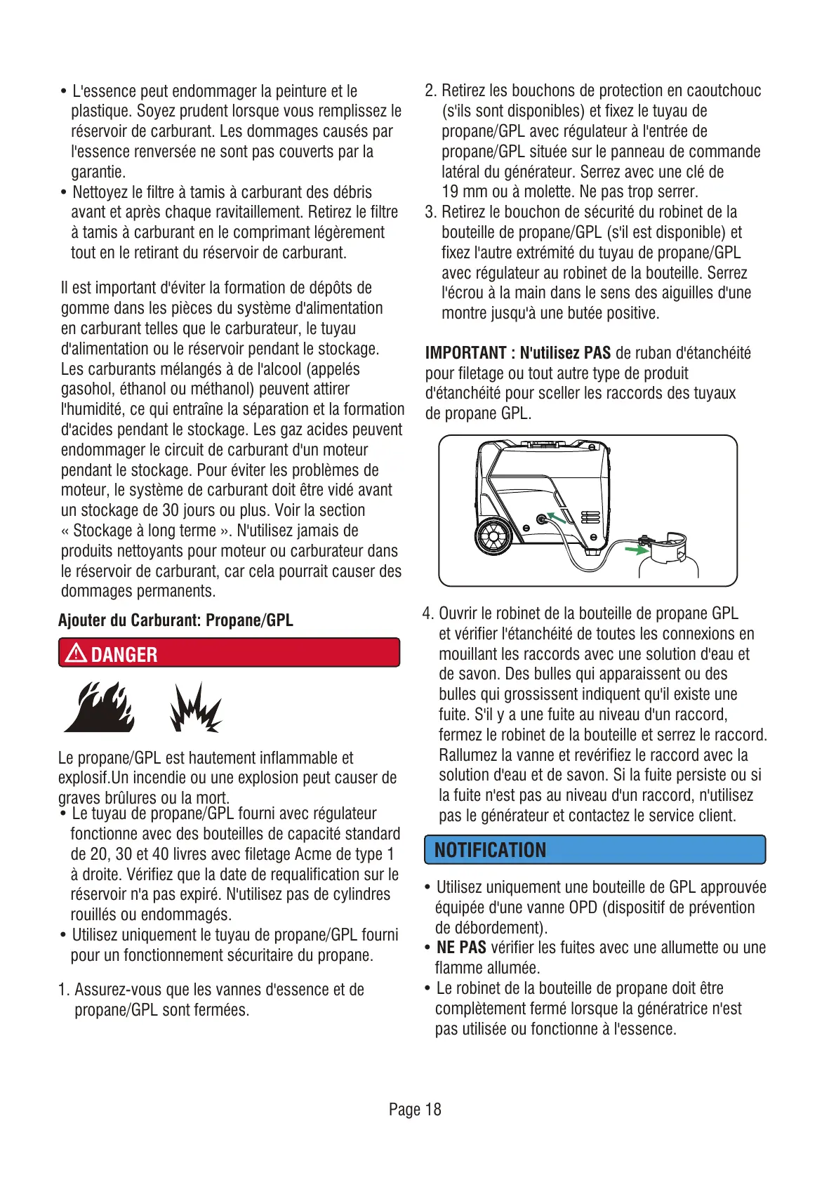 • Le robinet de la bouteille de propane doit être