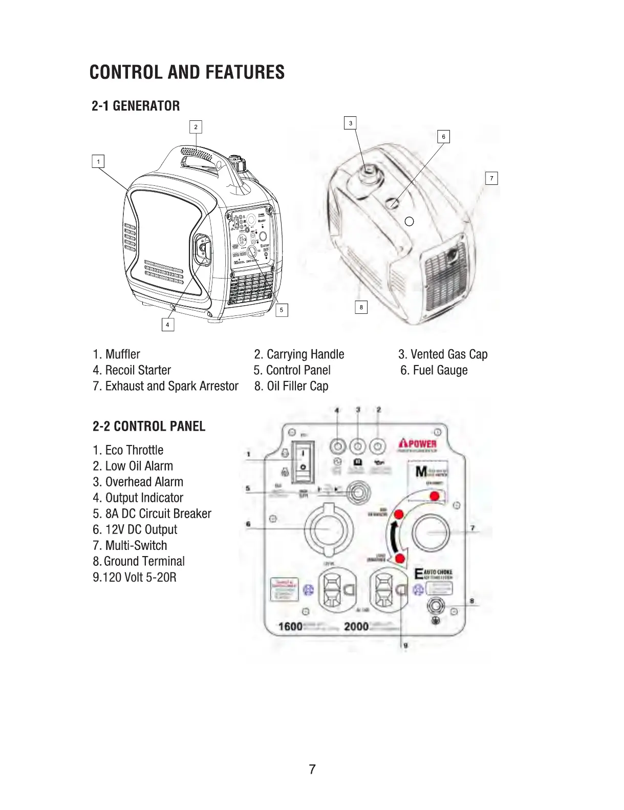 iPower SC2000I - Control and Features; Generator Components; Control Panel Overview