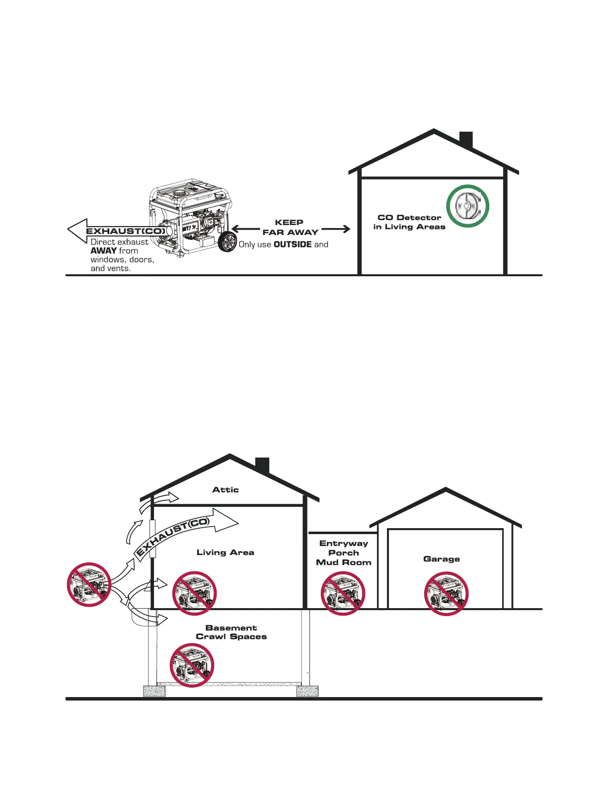 • Operate generators outside and at least 20 feet away from any structure with exhaust pointed away from doors