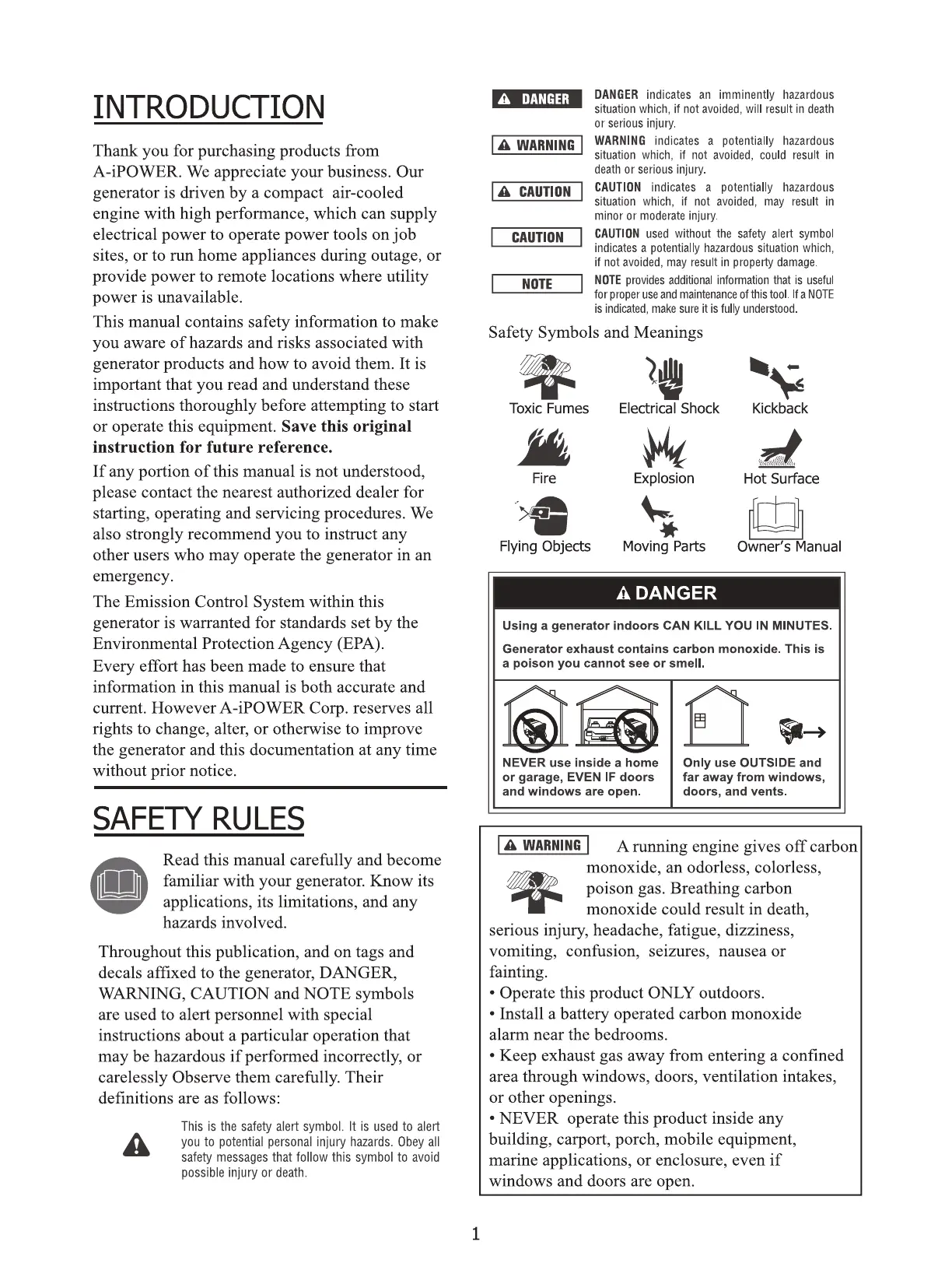 iPower SUA12000E - Introduction and Safety; Safety Rules and Warnings