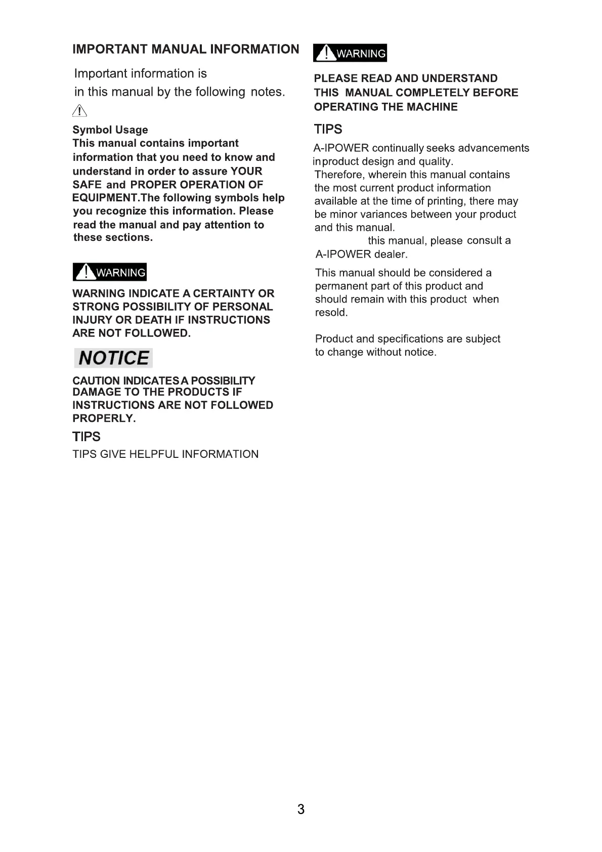 iPower SUA2000iD - IMPORTANT MANUAL INFORMATION; Symbol Usage Explanation; Manual Notes and Tips