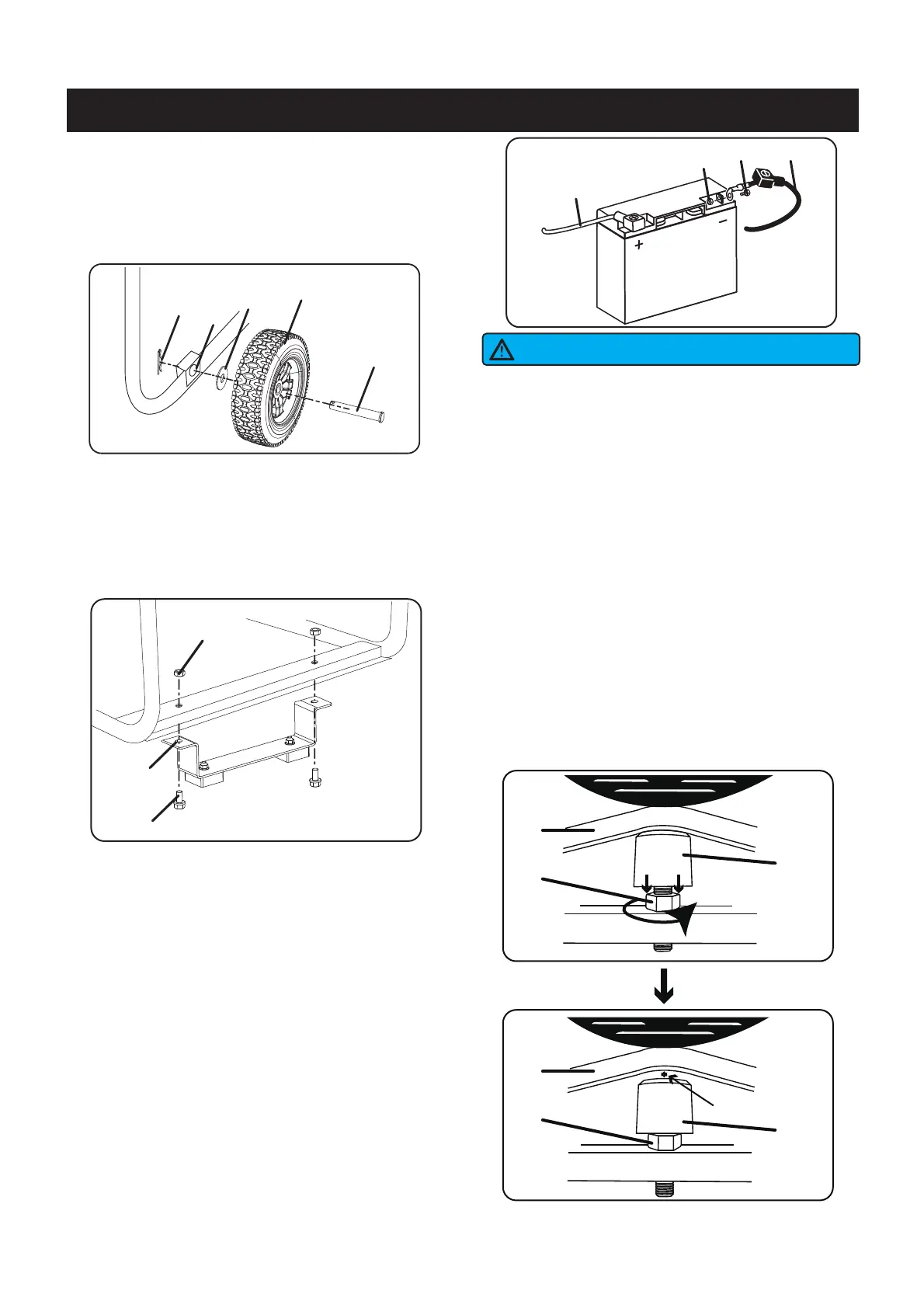 roue (B), la rondelle plate (C) et le trou de l'essieu du