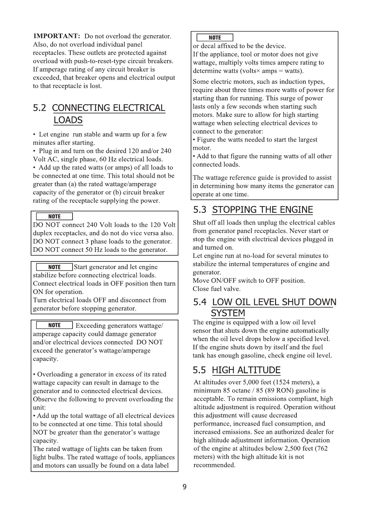 iPower SUA7000 - Load Connection and Generator Capacity; Generator Overload Protection; Connecting Loads and Wattage Guide; Safe Engine Shutdown Procedure
