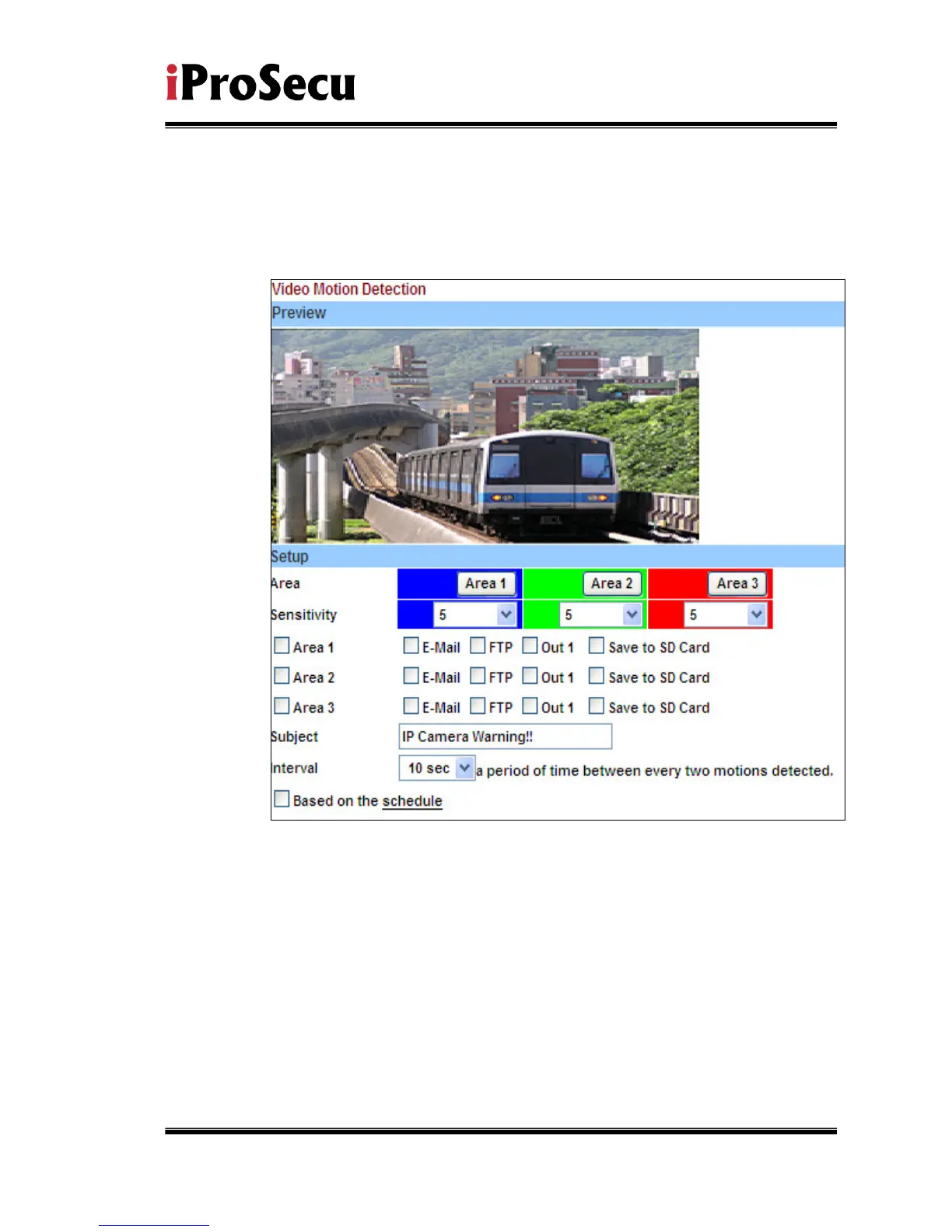 IP CAMERA allows 3 areas motion detection. When motion is