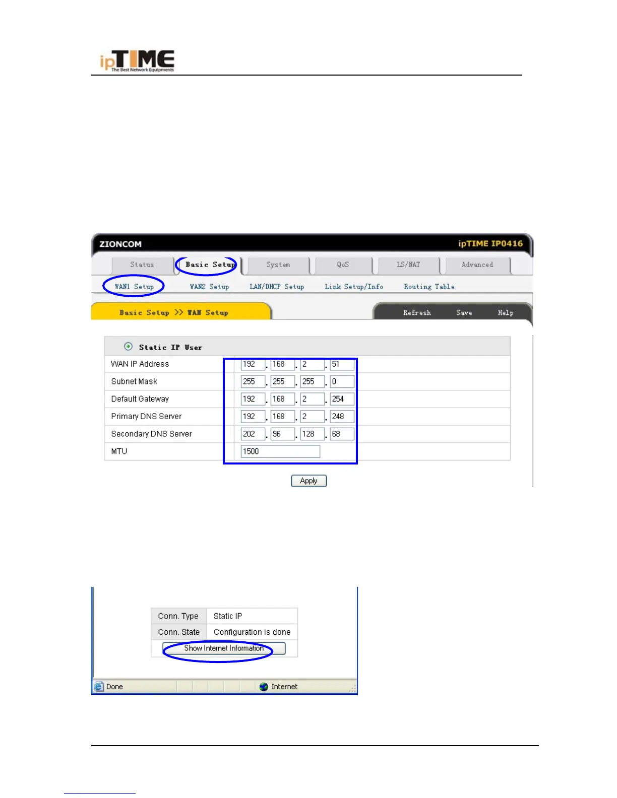 (3) Input WAN IP address, Subnet mask, Default Gateway, Primary DNS Server