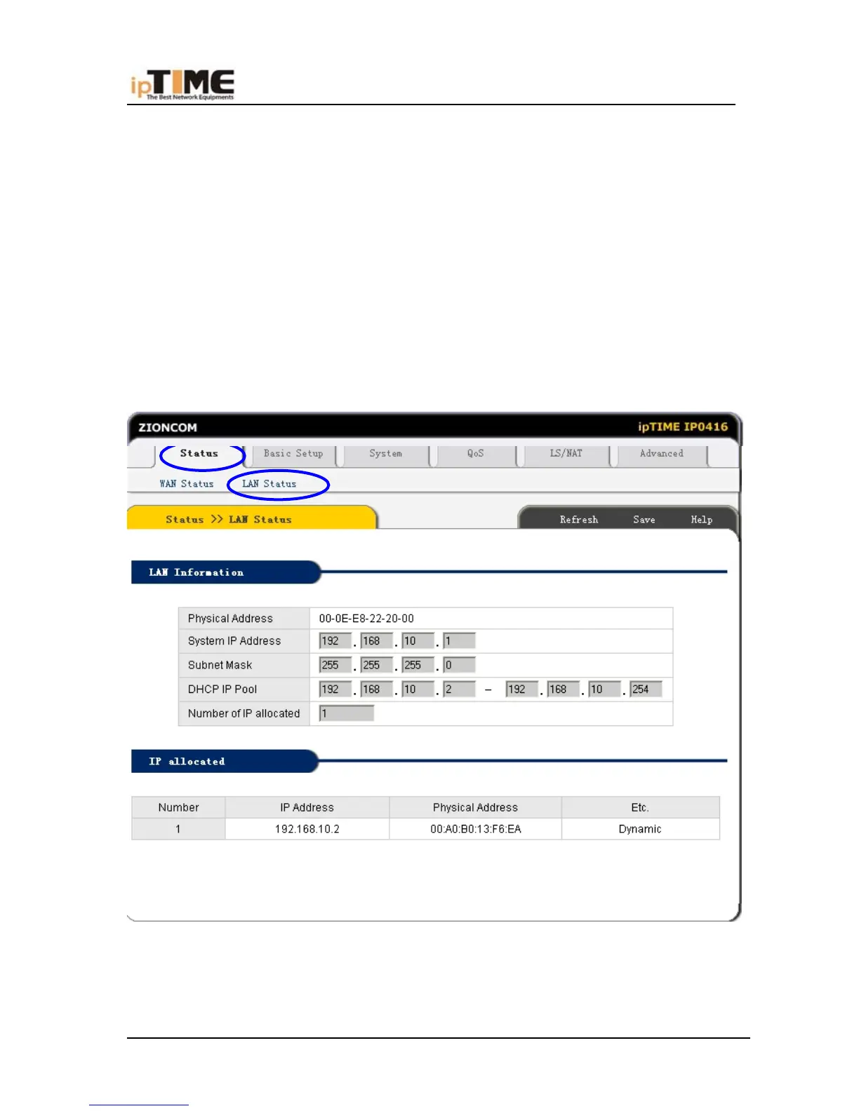 wireless connection ) and DHCP server status, include MAC address of the LAN