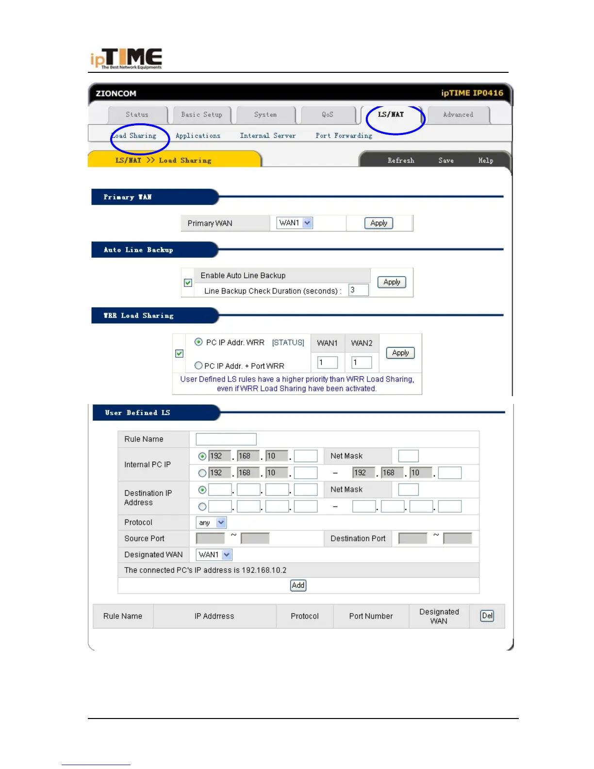 ipTime IP0416 - Load Sharing and NAT; Load Sharing Configuration