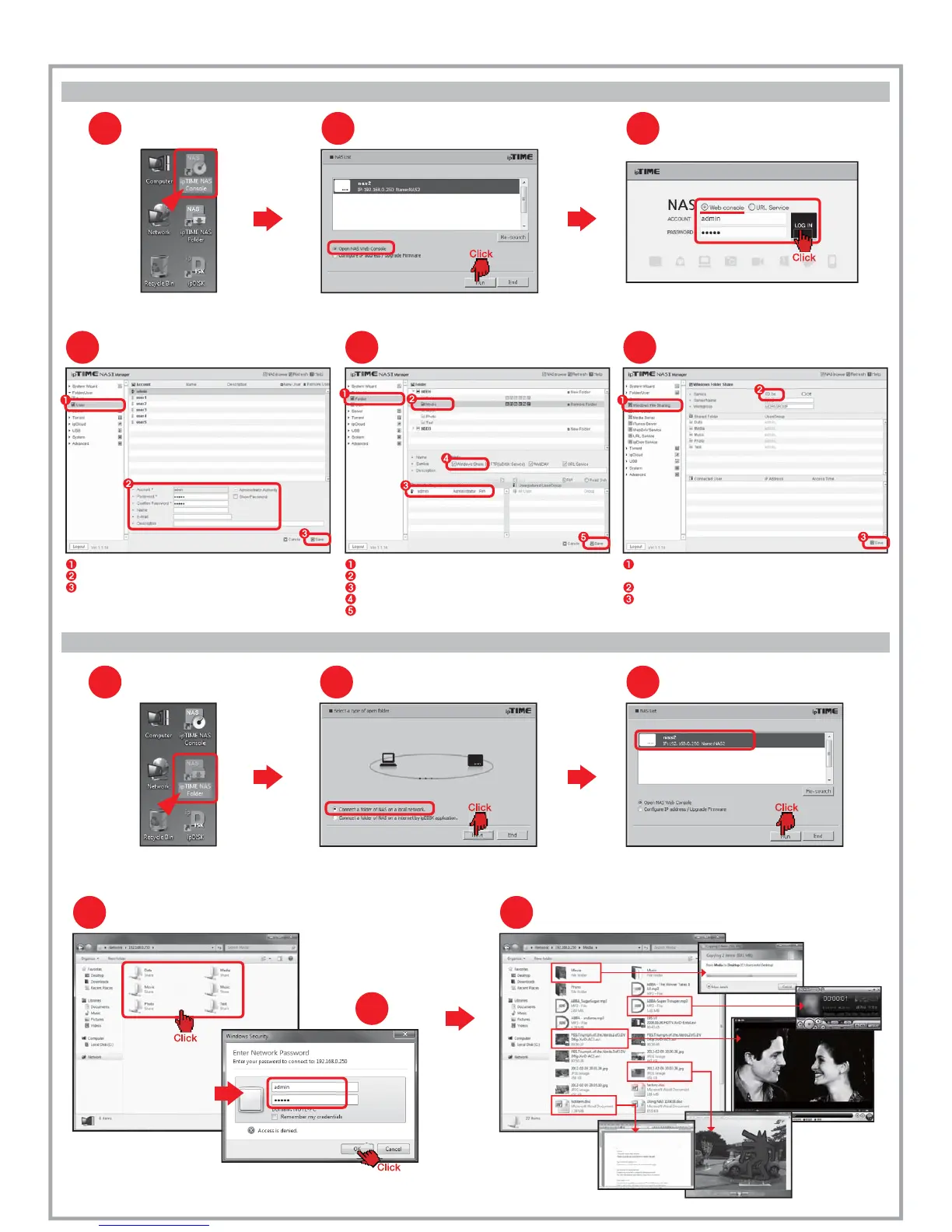 To use NAS in windows file sharing, following setup need to be done through the web console.
