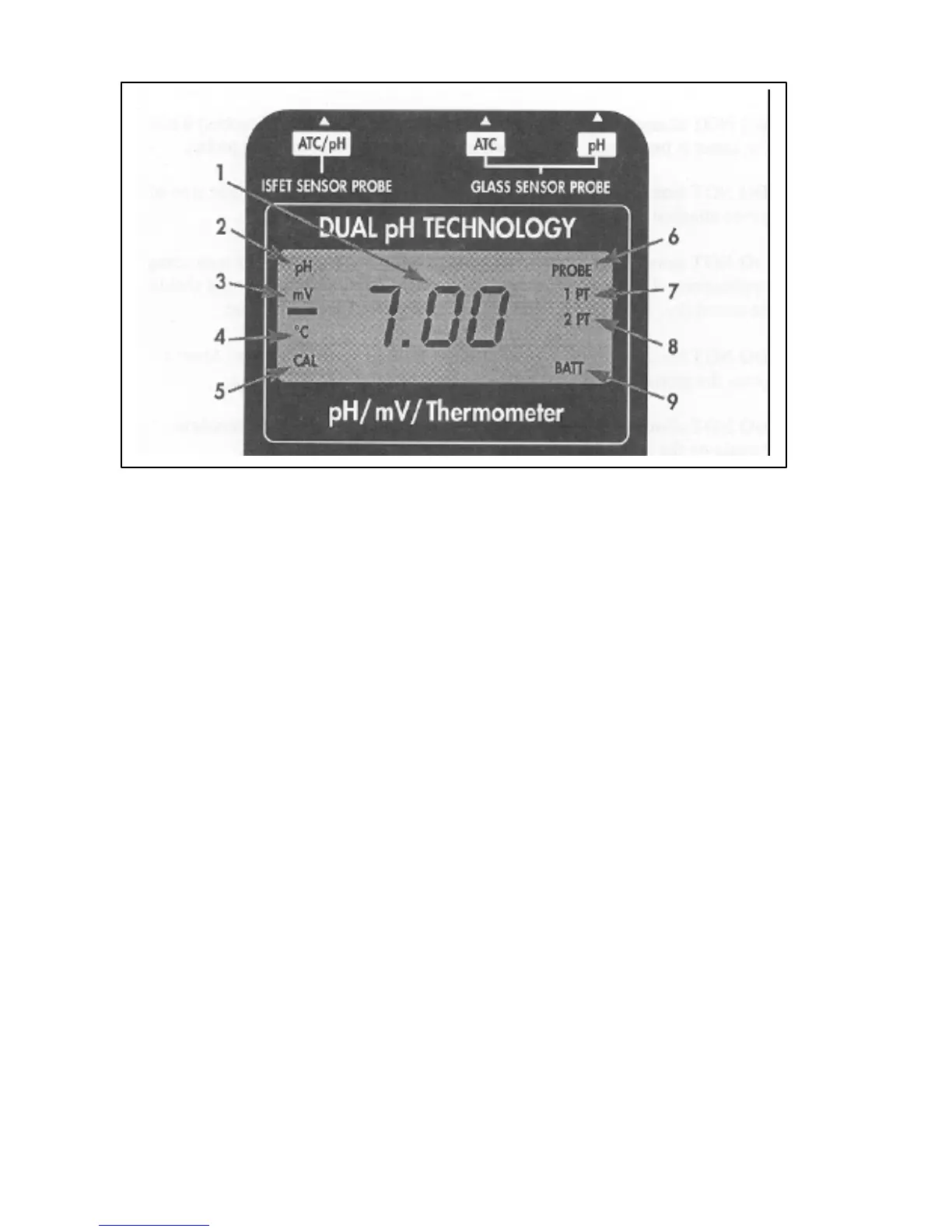 6. ISFET Probe Indicator. PROBE is displayed when pH meter has detected the