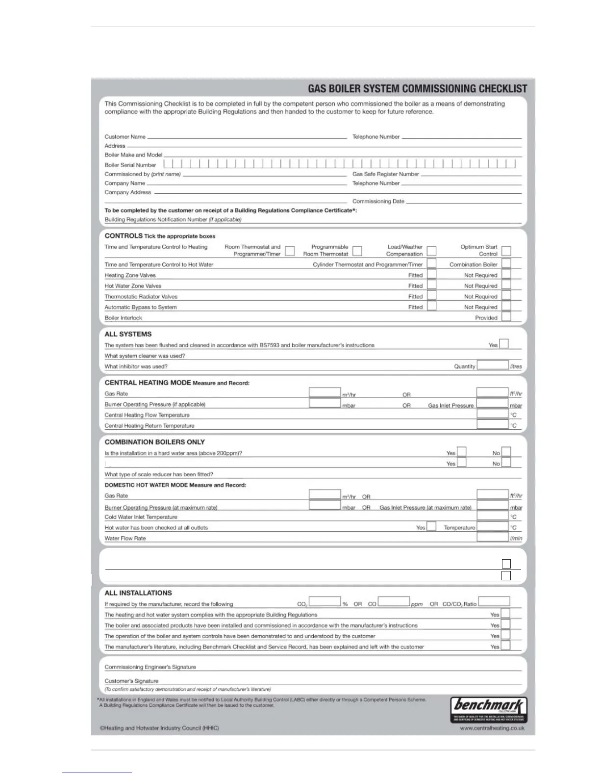 Failure to install and commission according to the manufacturer’s instructions and complete this Benchmark Commissioning Checklist will invalidate the warranty. This