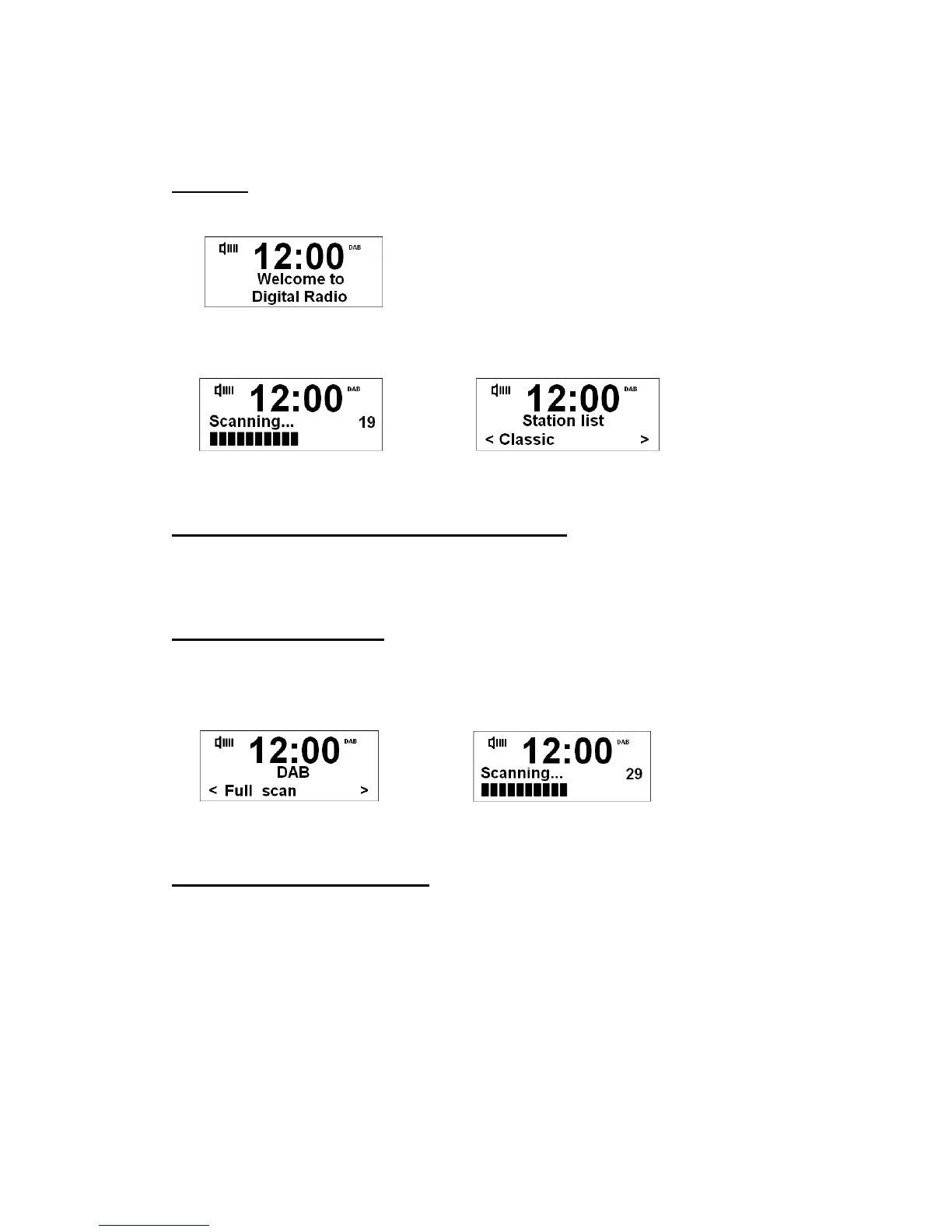2. For initial use, radio will make a full scan and store all detected stations into memory.