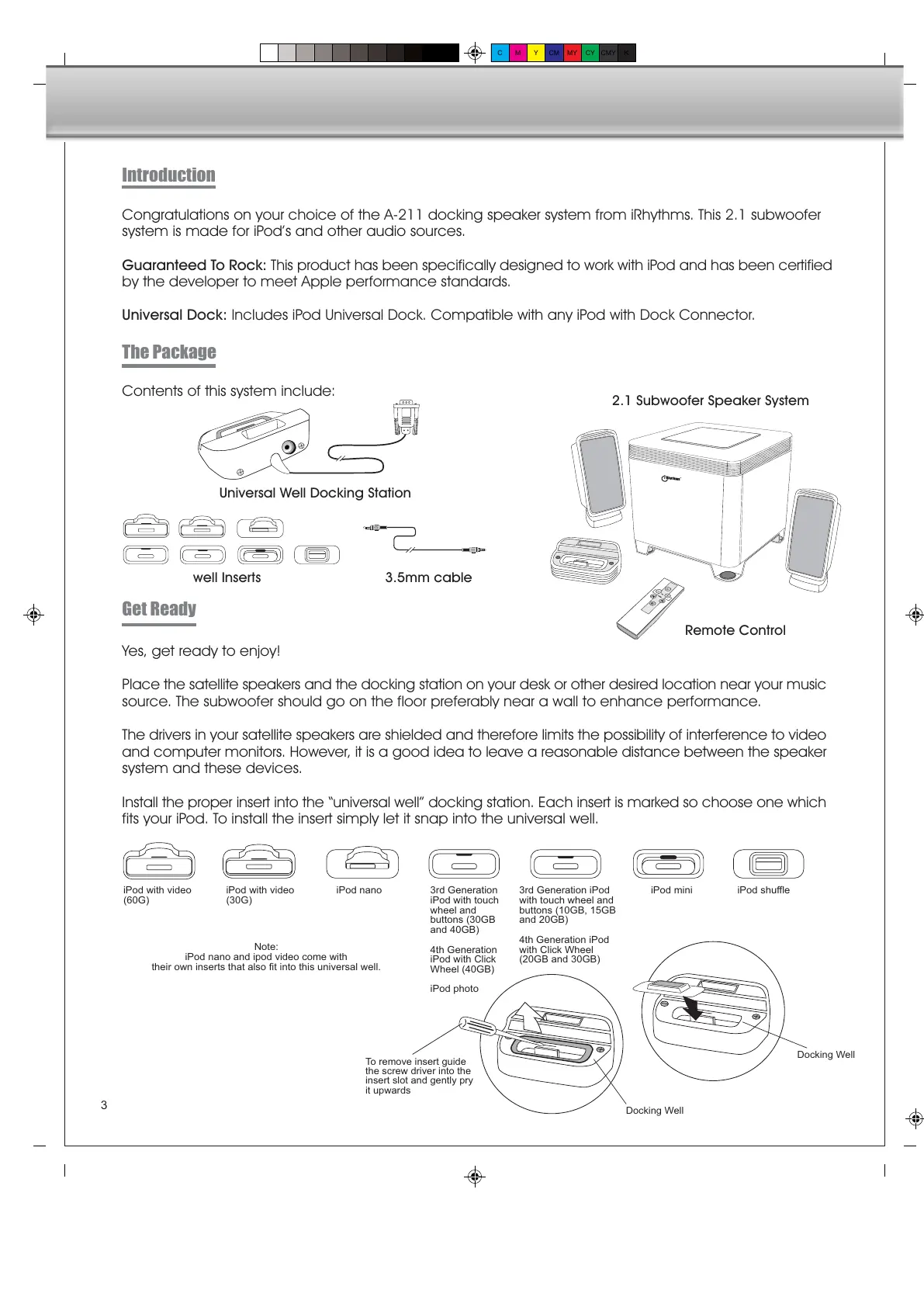 Congratulations on your choice of the A-211 docking speaker system from iRhythms. This 2.1 subwoofer