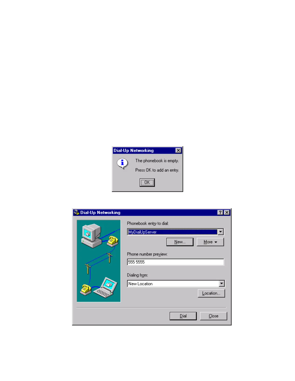 Networking window. If Dial-Up Networking has no “phonebook entries”, the following window
