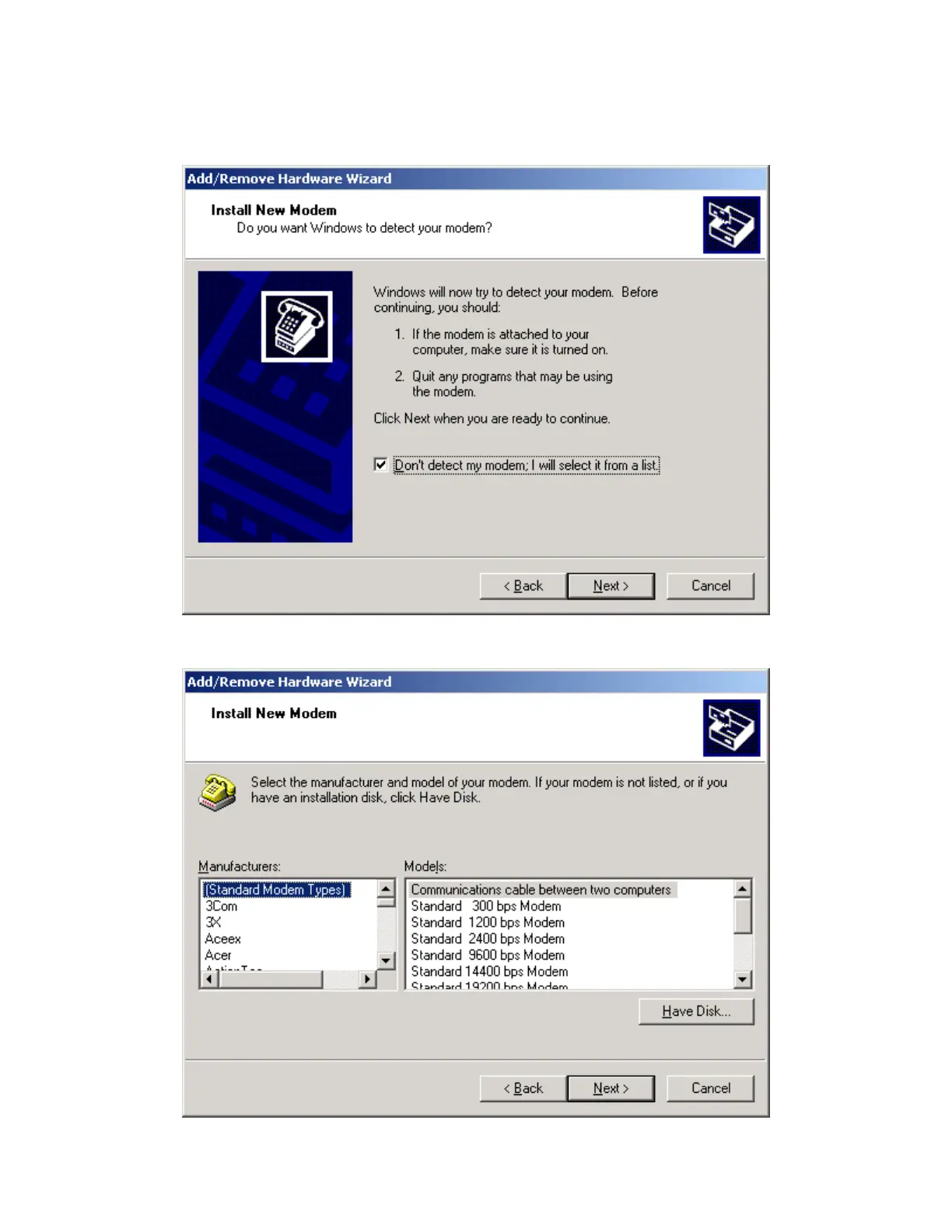 Next > to open the Install New Modem window of the Add/Remove Hardware Wizard.