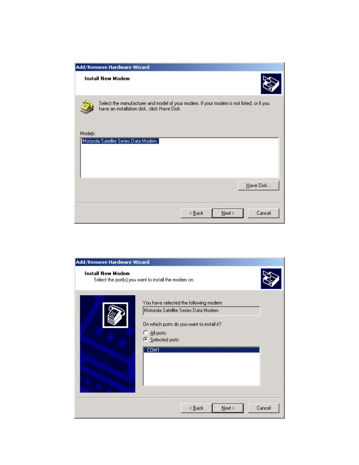9. In the Install New Modem window, select the Motorola Satellite Series Data Modem and click