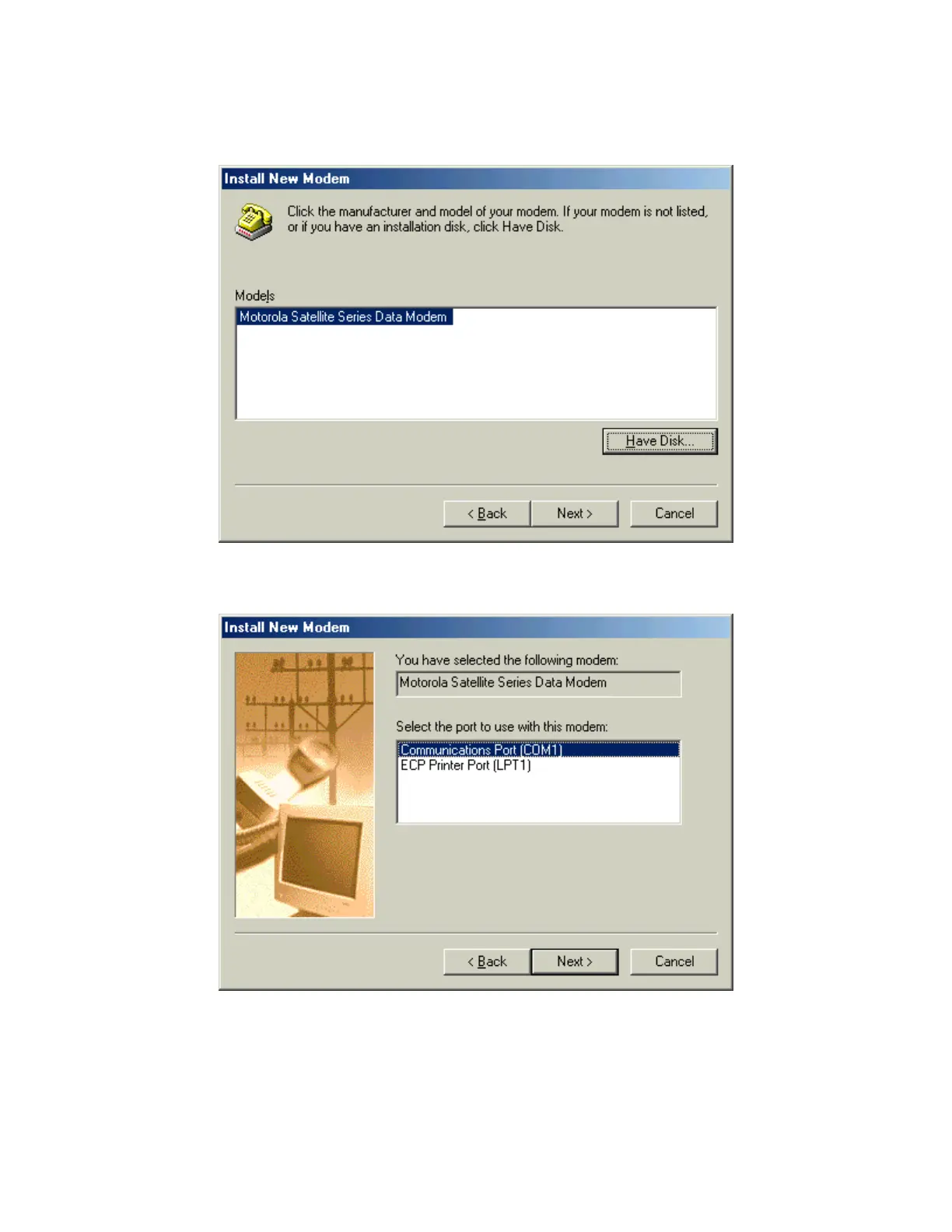 10. In the Install New Modem window, select the Motorola Satellite Series Data Modem and click