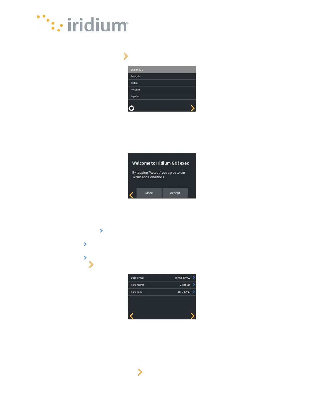 • The Iridium GO! exec date format can be configured as either mm/dd/yyyy or dd/mm/yyyy.
