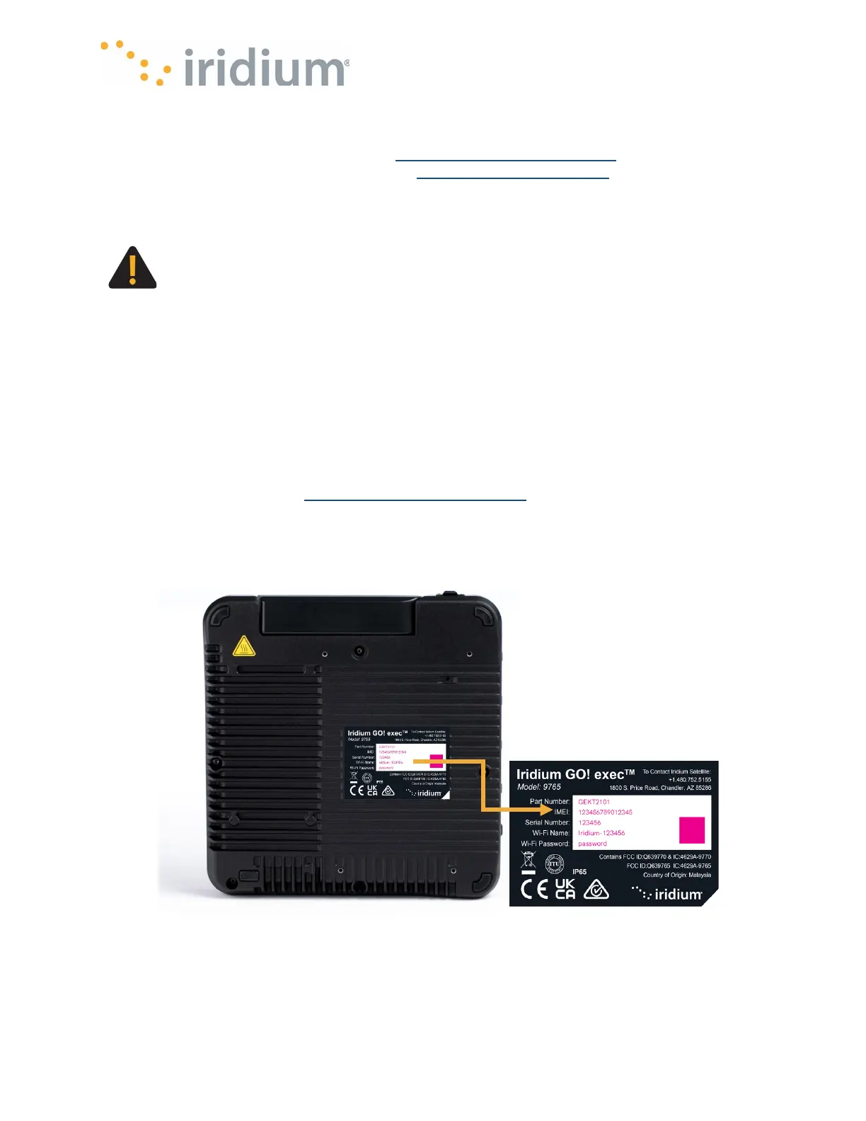 (shown on the device label on the base of the Iridium GO! exec).