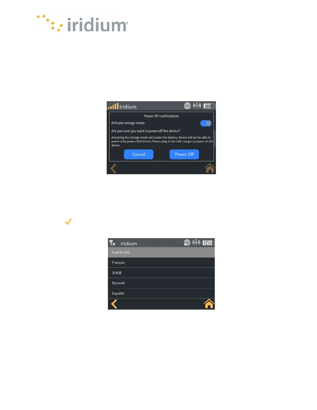 The Device language can be configured from the Device Menu to one of the following: Russian,