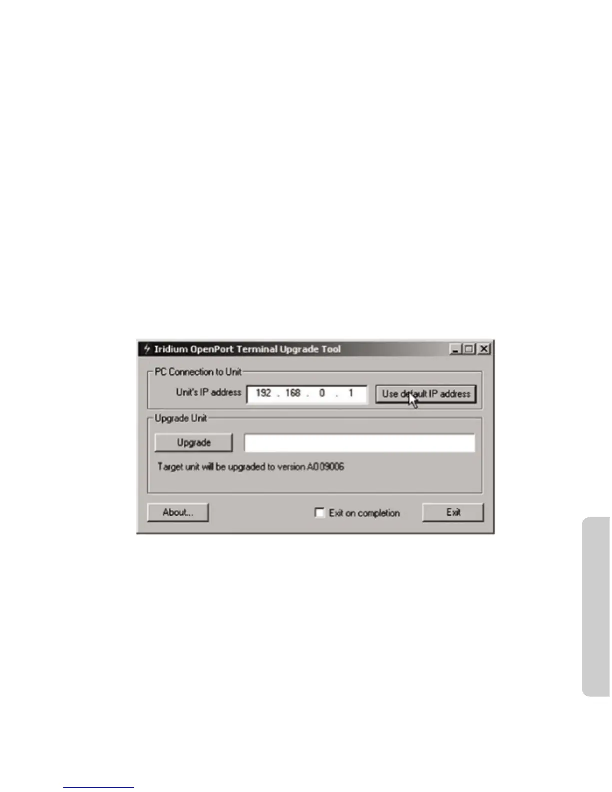 4. Double click the Iridium Pilot Upgrade tool executable. The following window will appear. Enter the IP