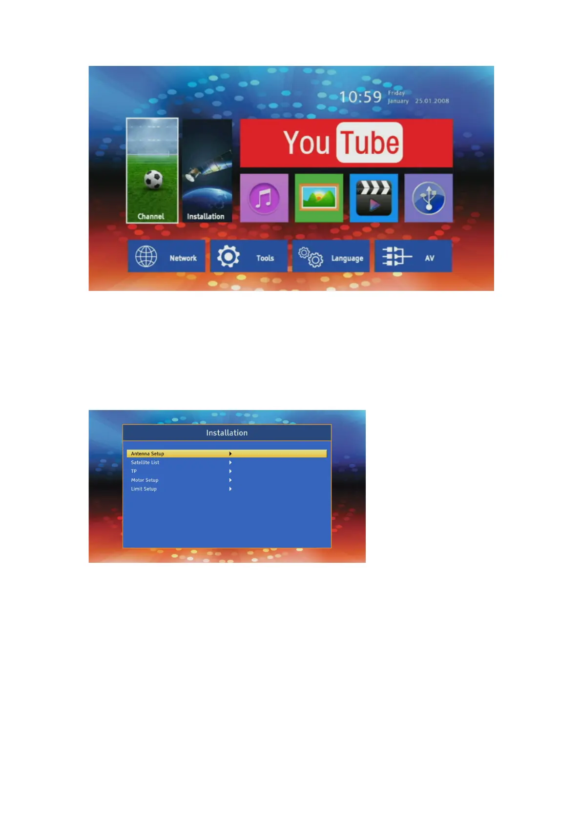 Users can Antenna Setup / Satellite / TP /Motor Setup/Limit Setups in the Installation