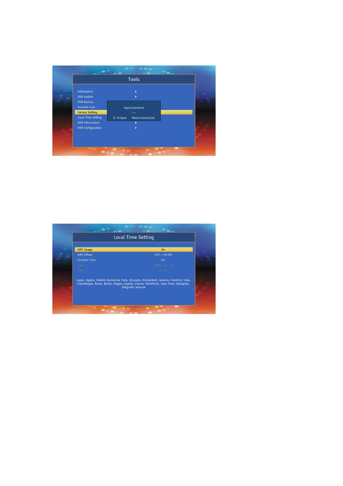 This menu is used to set the time and date. The receiver can automatically download the time and