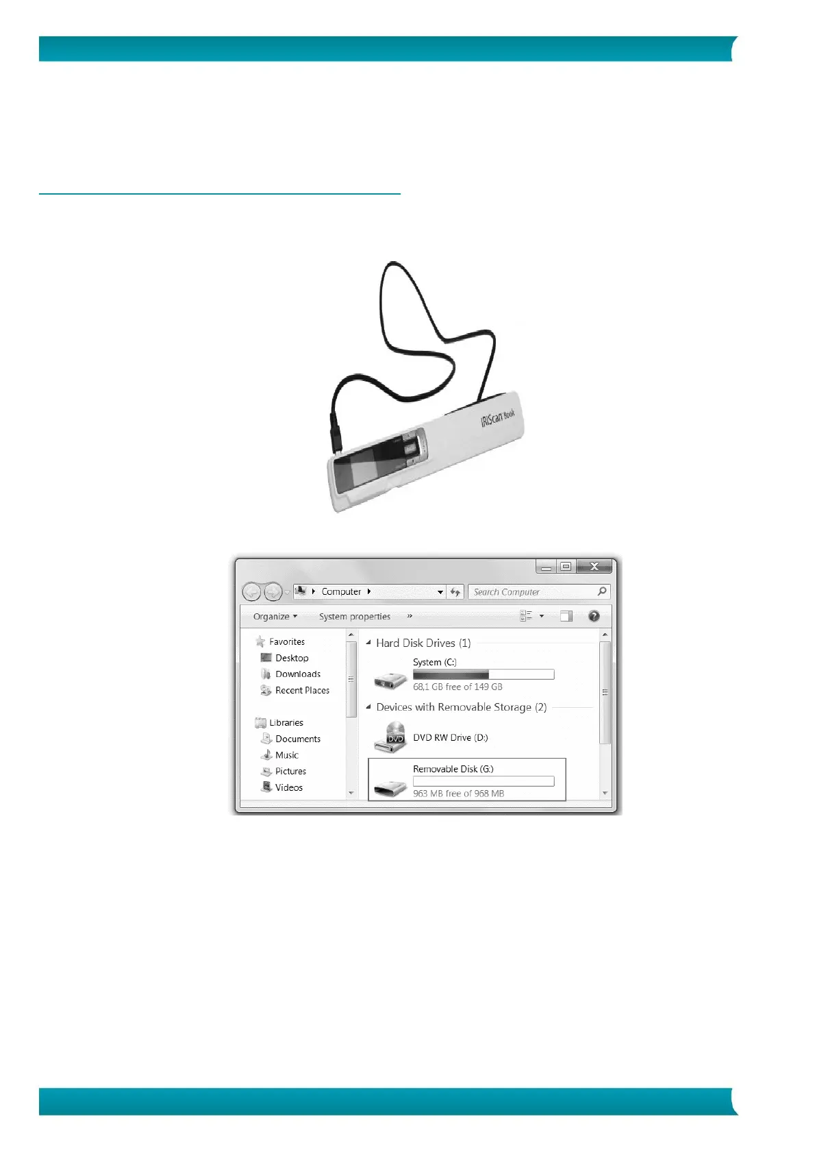 2. Plug in the provided mini USB cable in both the IRIScan™ Book and your computer.