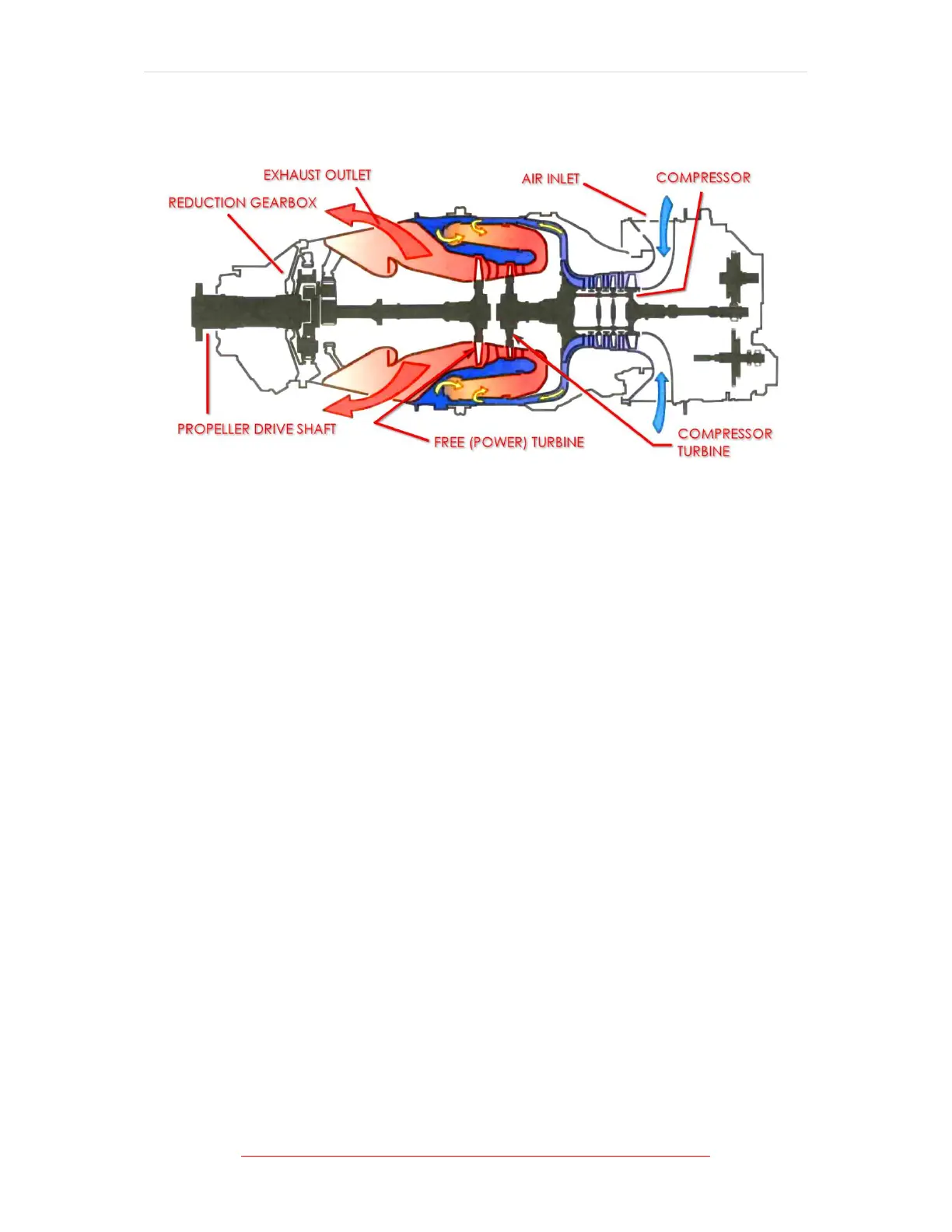 flow power turbine, exhaust case, and reduction gearbox.