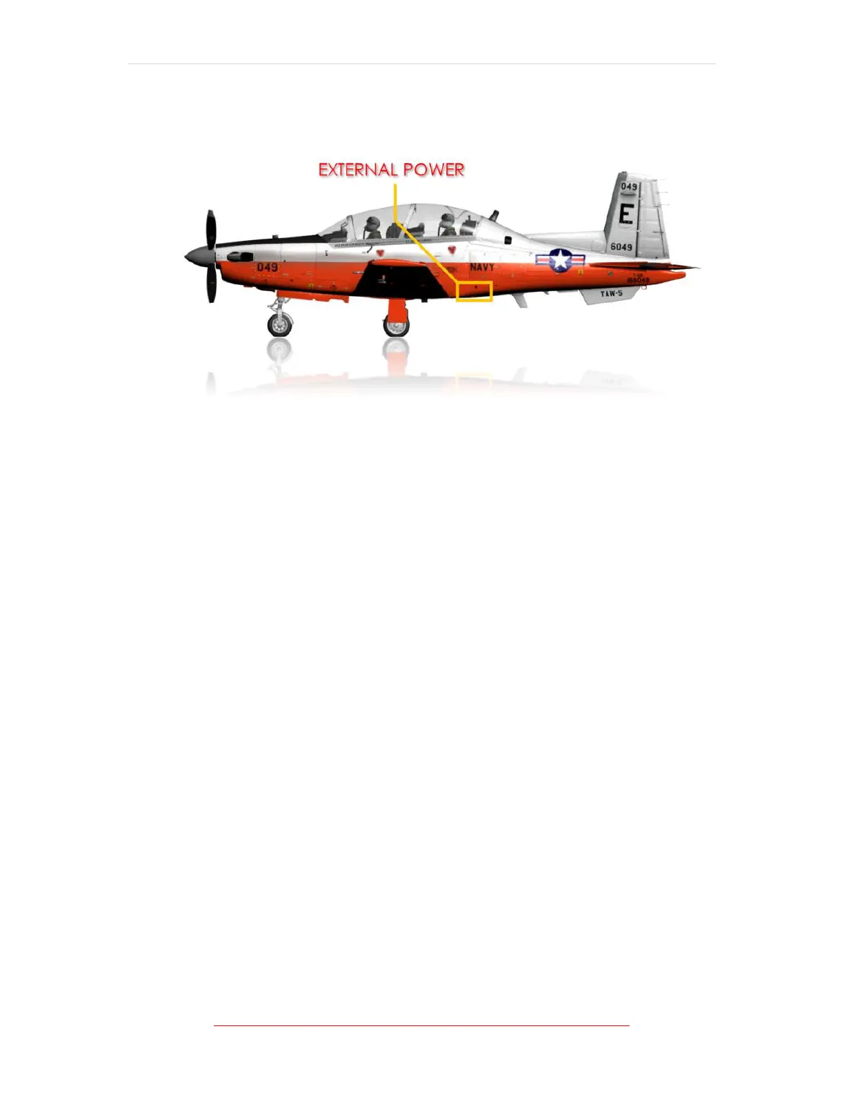An external power receptacle is installed in the left, aft fuselage, below the left