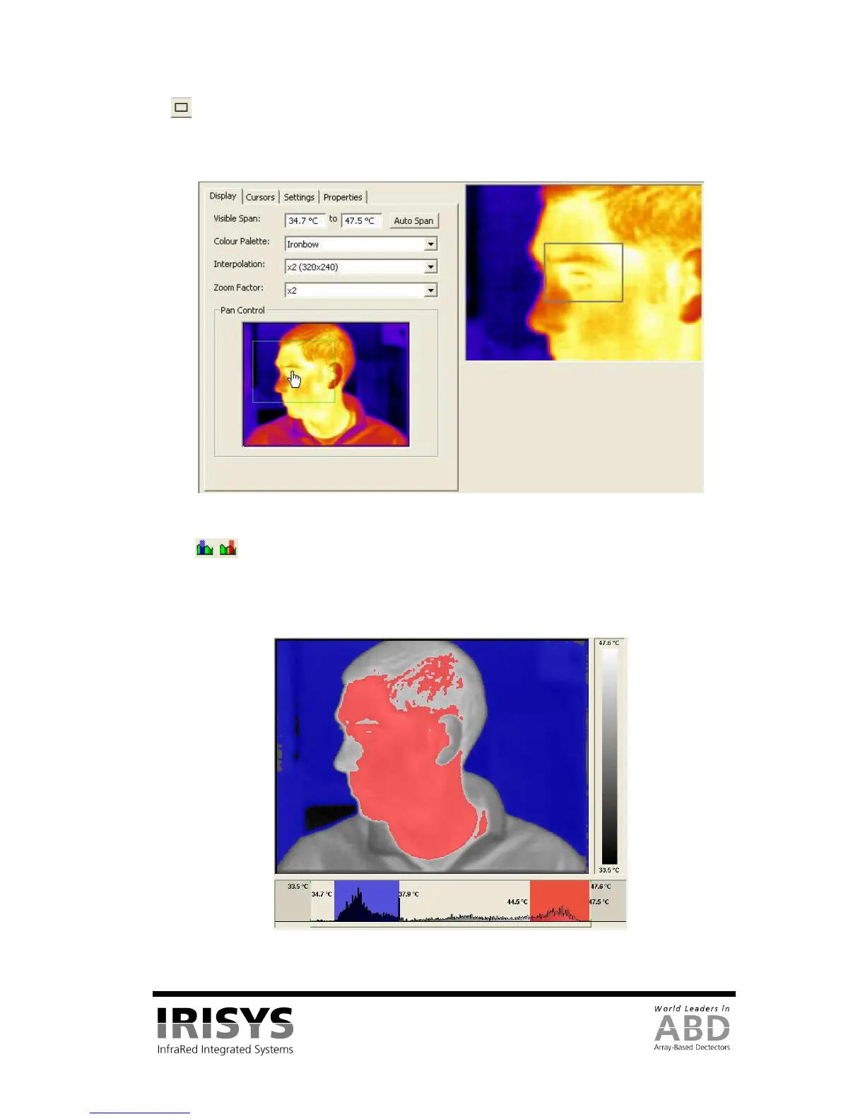 temperature in the image. A red and/or blue semi transparent block appears on the histogram which can be