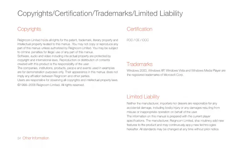 IRiver T6 - Copyrights;Certification;Trademarks;Limited Liability