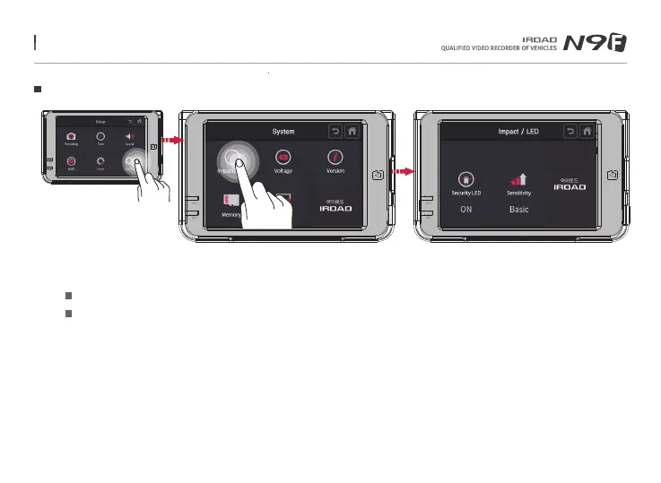 Tap on Impact/LED button on the system screen to adjust security LED and sensitivity while a car is parked.