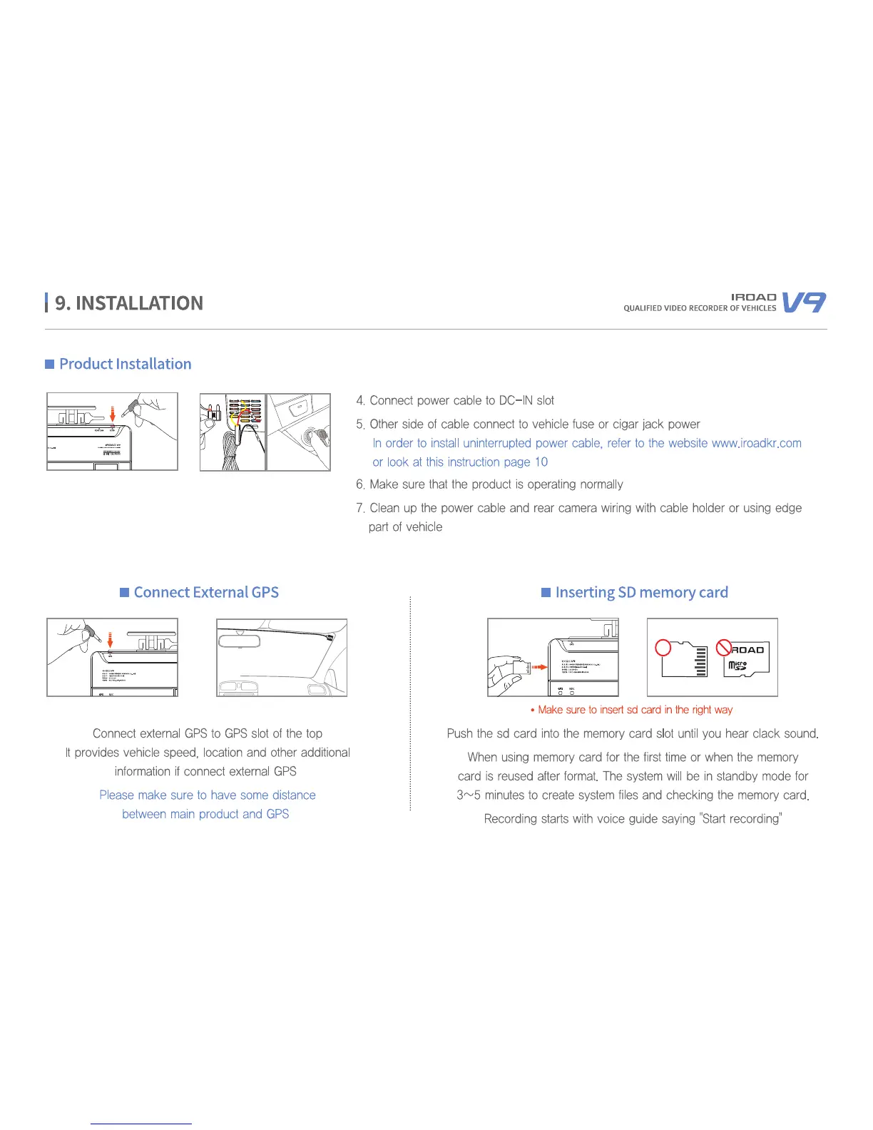 IROAD V9 - Installation Procedures; Connecting Power and Wiring; GPS and SD Card Installation