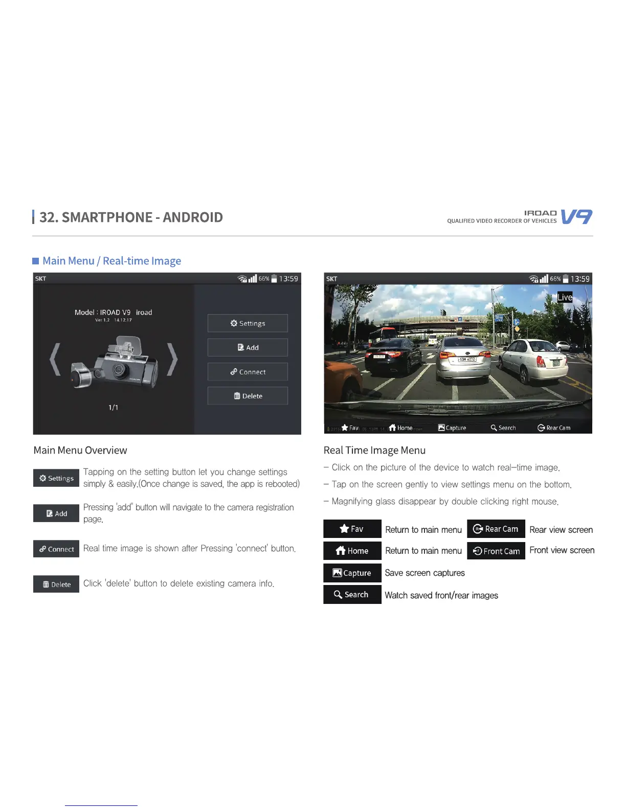 IROAD V9 - Android App - Main Menu and Live View; Main Menu and Real-time View