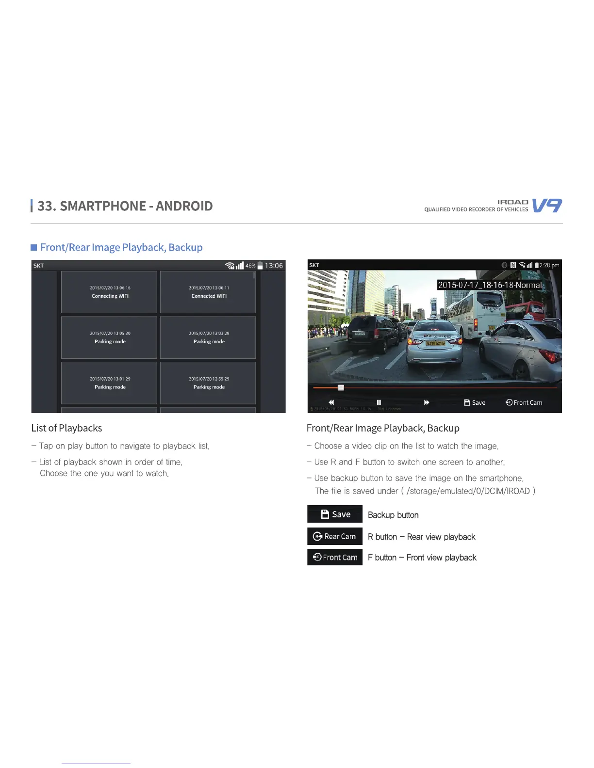 IROAD V9 - Android App - Playback and Backup; Playback and Backup of Recordings